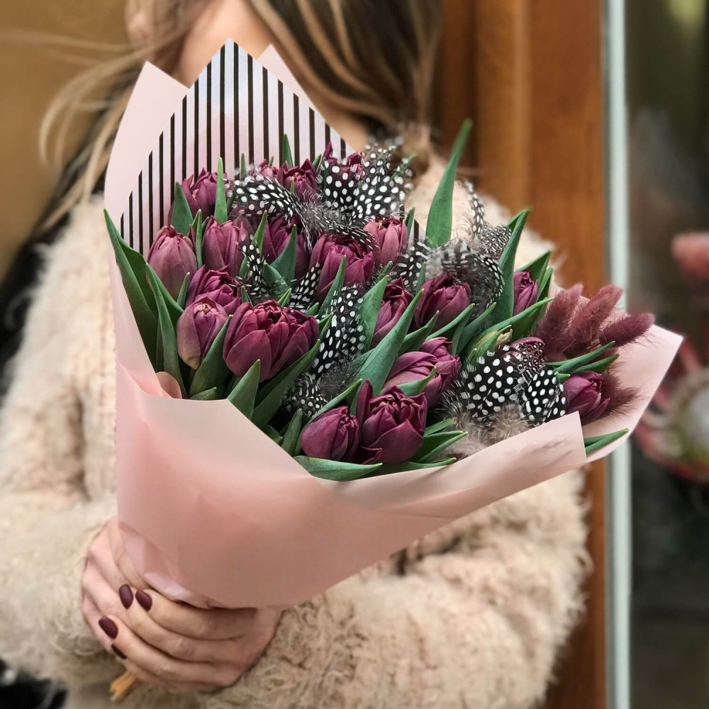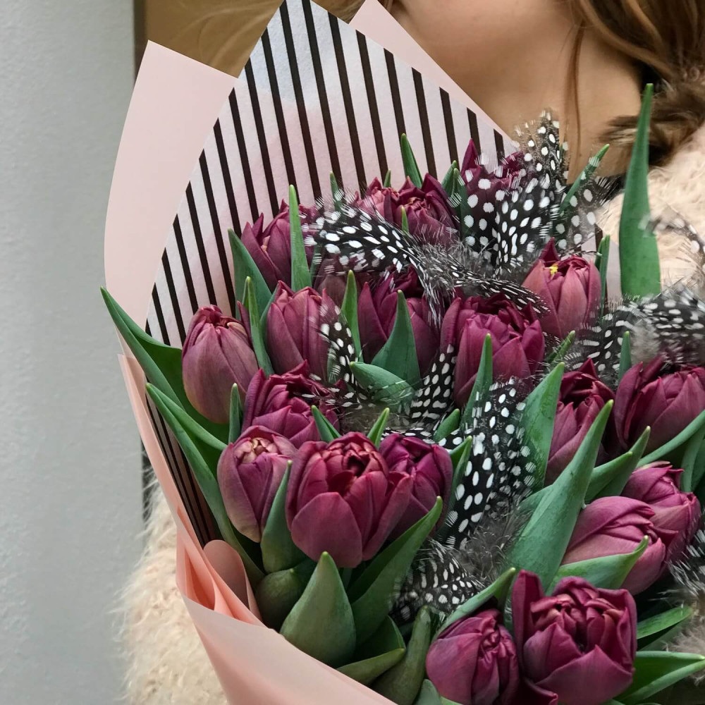 Фіолетові піоновидні тюльпани та пір'ячко