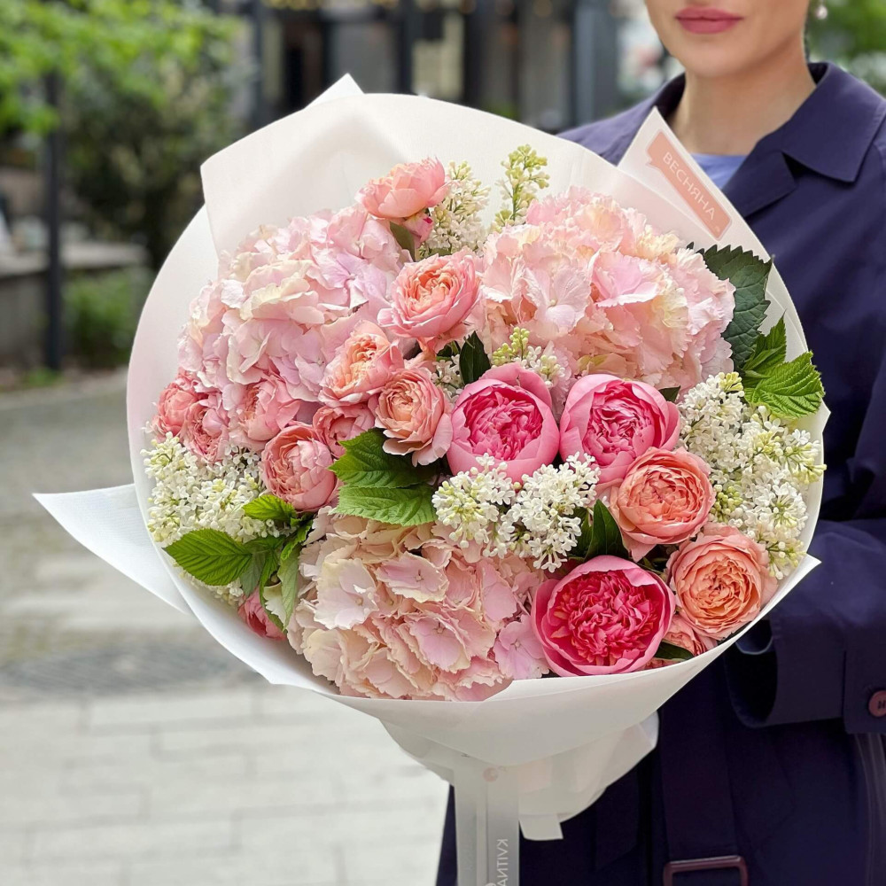 Квіти: Гортензія, Півонія, Троянда кущова піоновидна, Бузок, Малина