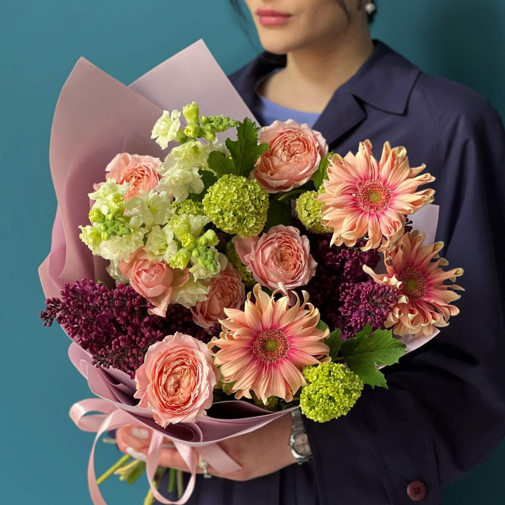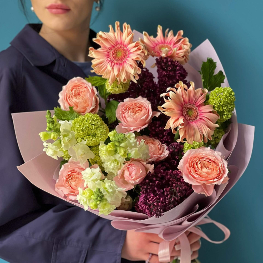 Квіти: Троянда кущова, Гербера, Бузок, Вібурнум, Антиррінум