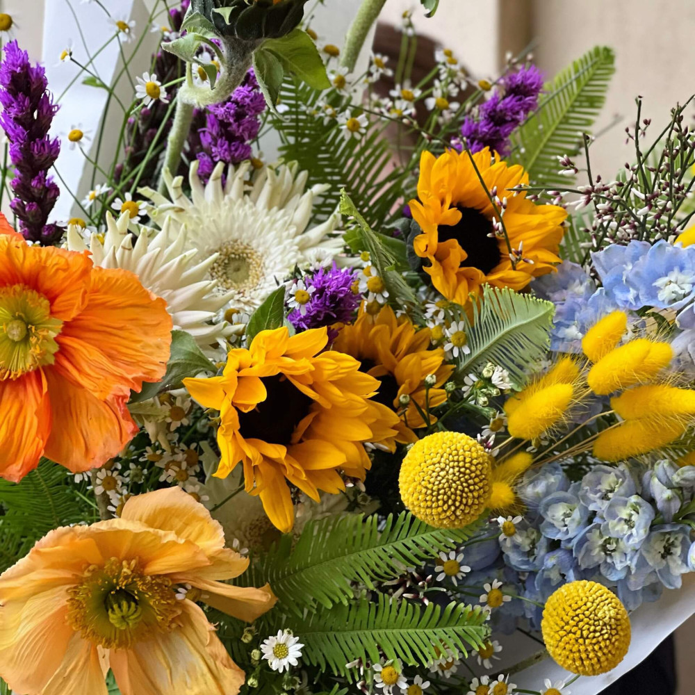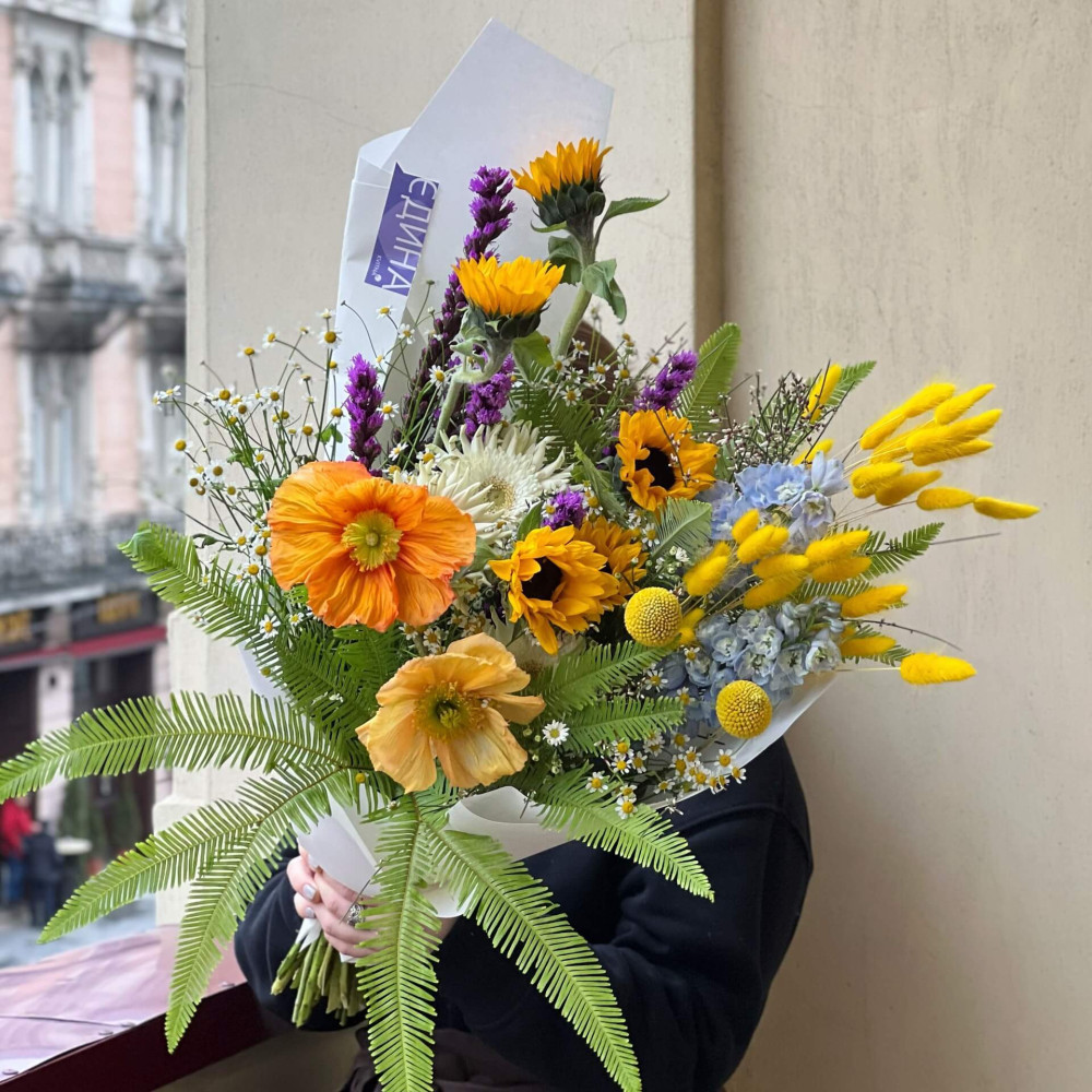 Квіти: Соняшник, Папавер (Мак), Краспедія, Лагурус, Танацетум, Амбрела, Дельфініум