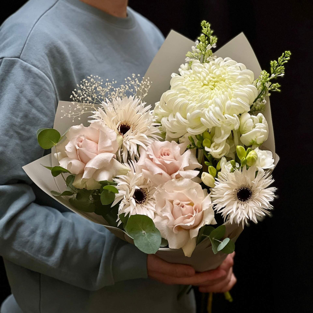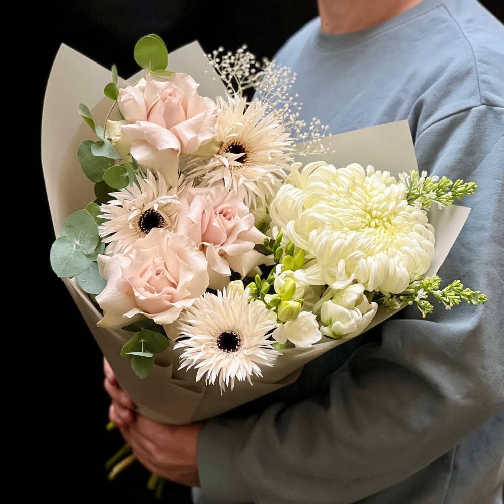 Квіти: Гербера, Троянда, Тюльпан, Фрезія, Бузок, Евкаліпт, Гіпсофіла