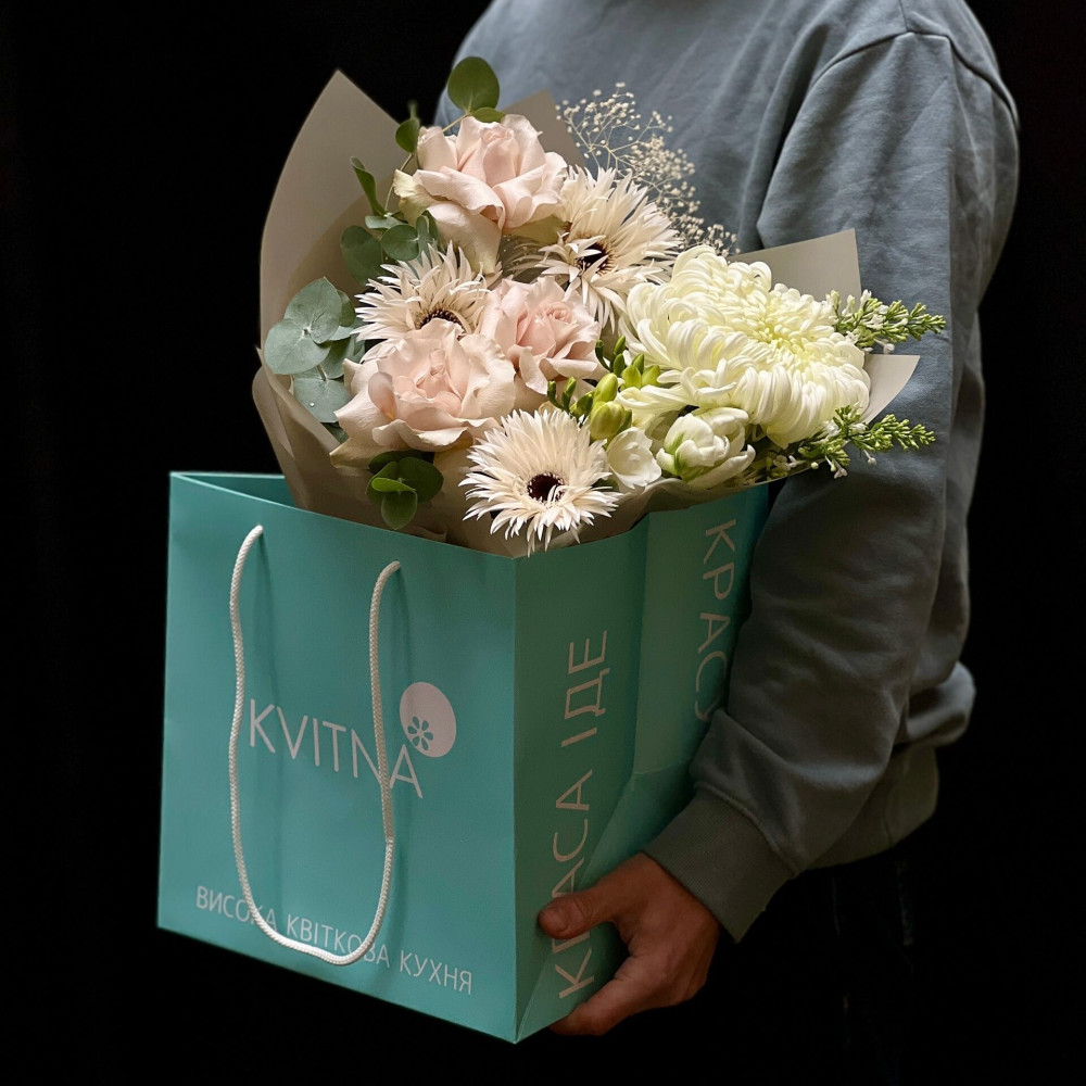 - Букети від Kvitna доставляються у фірмовому пакуванні, яке потрібно зняти при установці квітів у вазу. Не зрізайте стрічку, звʼязуючу букет, щоб зберегти його форму.