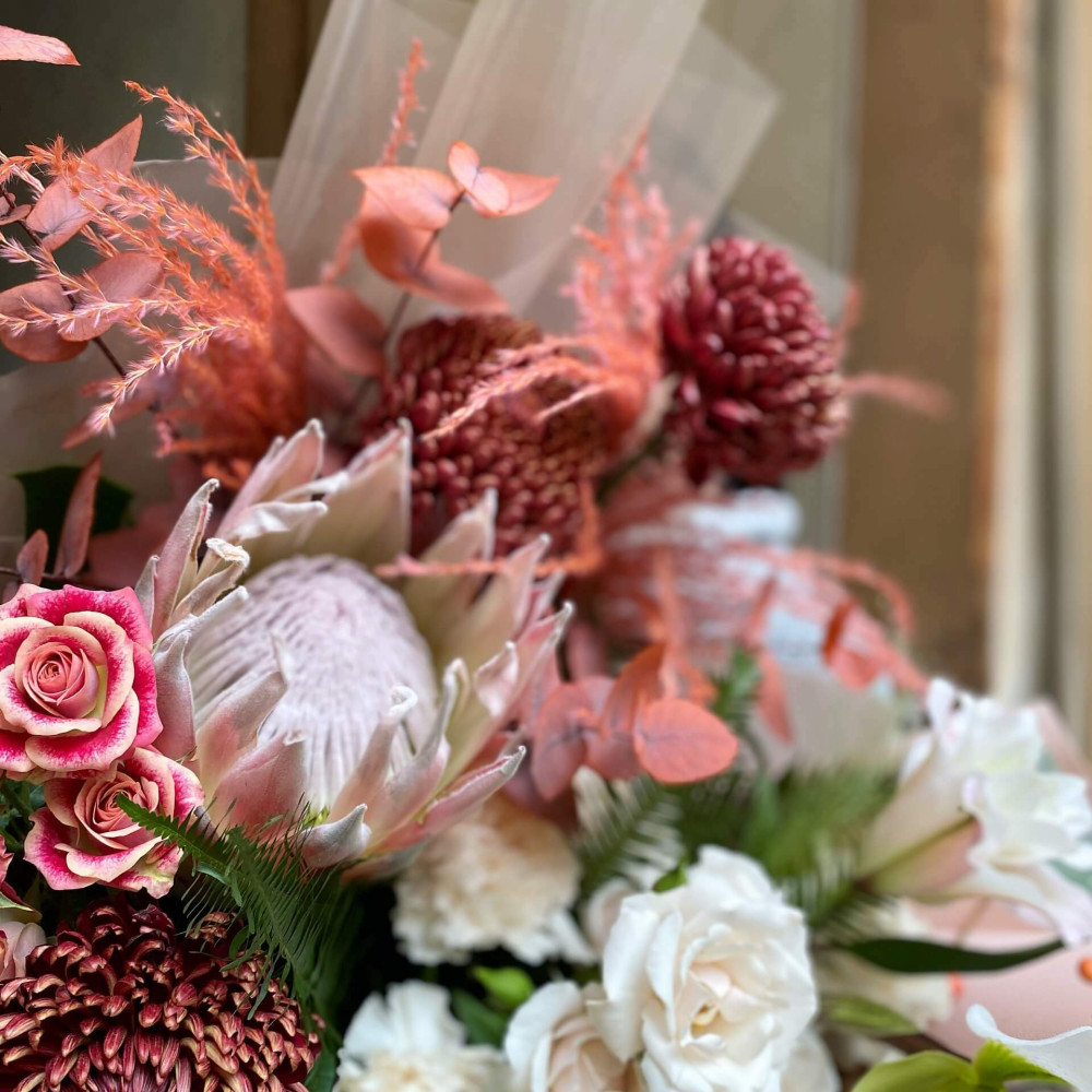 Квіти: Протея, Хризантема, Троянда кущова, Лілія, Евкаліпт, Півонія, Еустома, Амбрела