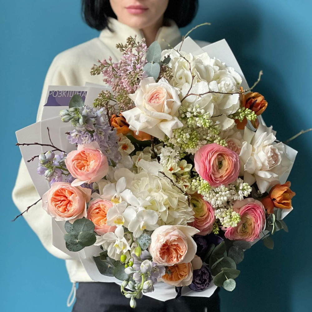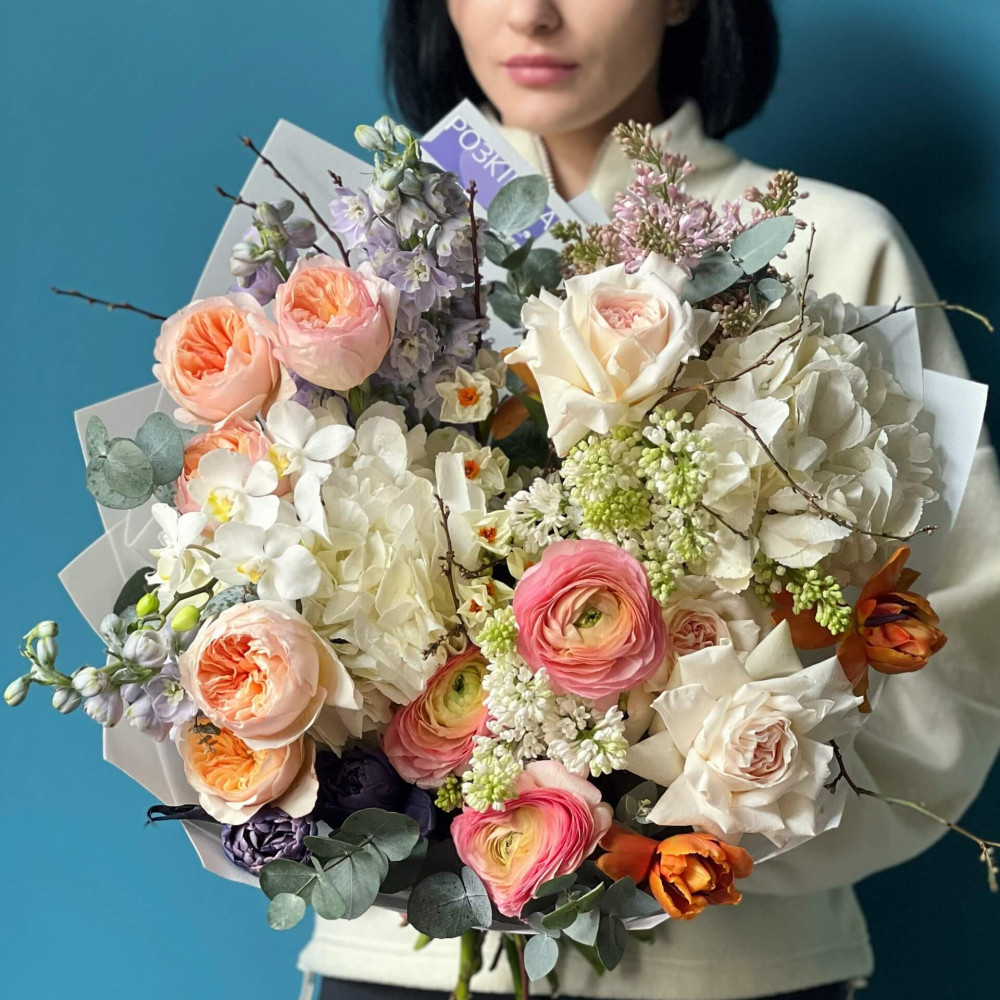 Квіти: Троянда піоновидна, Гортензія, Ранункулюс, Бузок, Нарцис, Дельфініум, Тюльпан