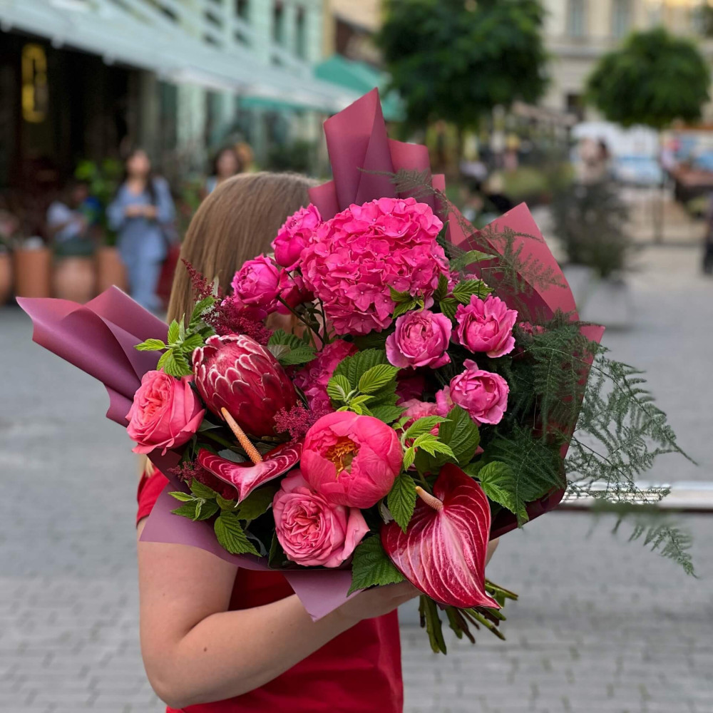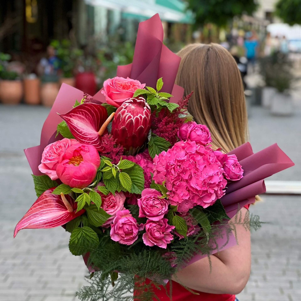 Квіти: Протея, Антуріум, Півонія, Троянда піоновидна кущова, Гортензія, Аспарагус, Малина (листя), Астільба, Троянда піоновидна