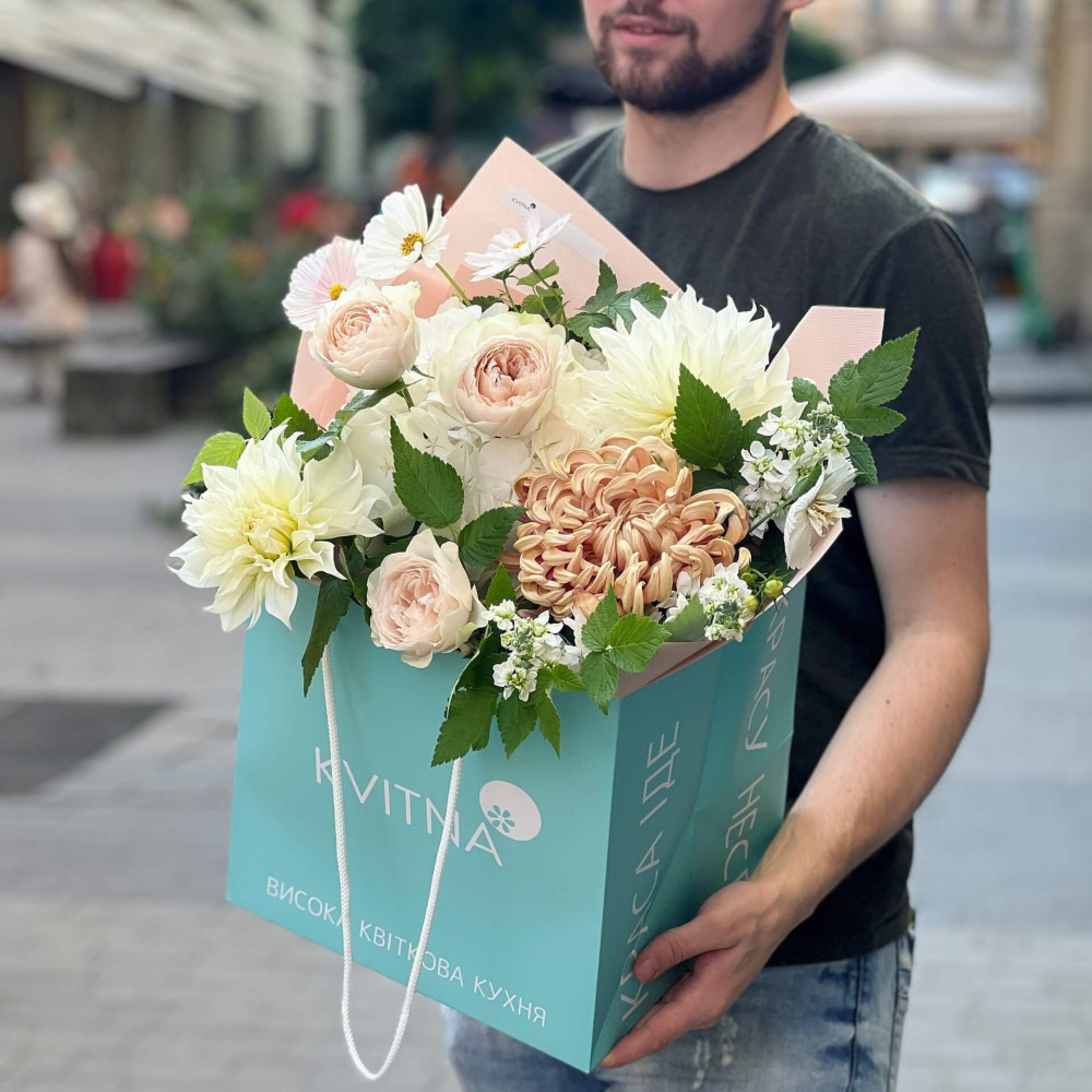 І це, до речі, зовсім не обов'язково плюси, це особливості, які потрібно розуміти. Тоді і вибір «де купити букет у Львові» зробити буде значно простіше.- Кожен букет Kvitna унікальний. Це означає, якщо Ви замовите у нас якийсь із букетів на сайті, то Ви не отримаєте точнісінько такий же. Деяких це бентежить, такі люди не хочуть «ризикувати», бажають «в точності, як на світлині». У «Квітна» кожен букет — це творчий пошук, це захоплення, злиття з квітами, образом одержувача і завданням. Так, ми можемо прийняти за вектор, зробити схожий букет, в тому ж стилі, кольоровій гамі, з тих самих квітів ... Але нам нудно робити за шаблоном. Адже букет, представлений на зображенні, робився для іншої людини, з іншого приводу, під інший настрій і натхнення. У Вас буде все по-іншому.
