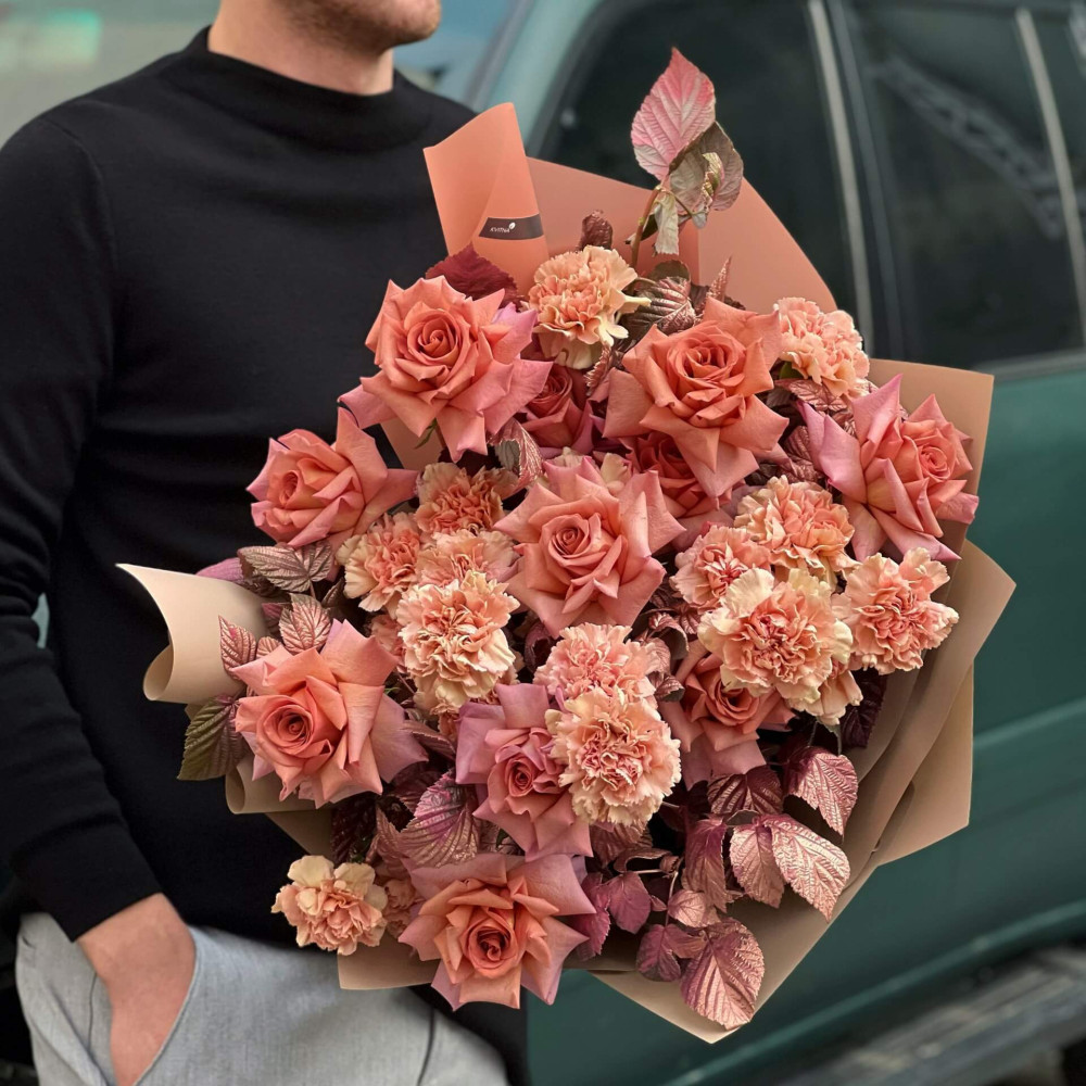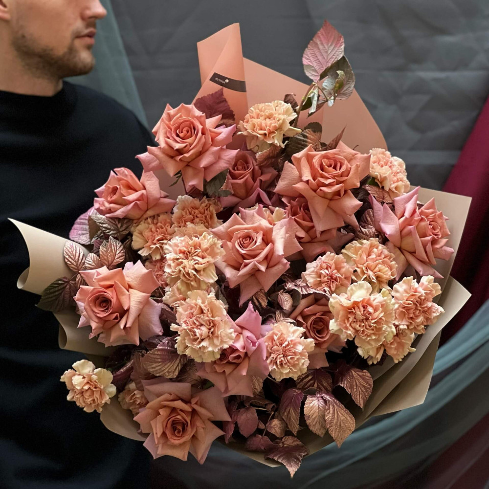 Осінньо-настроєвий букет з трояндами дивовижного корично-бузкового відтінку, який зробить твою осінь чарівною і розкішною.