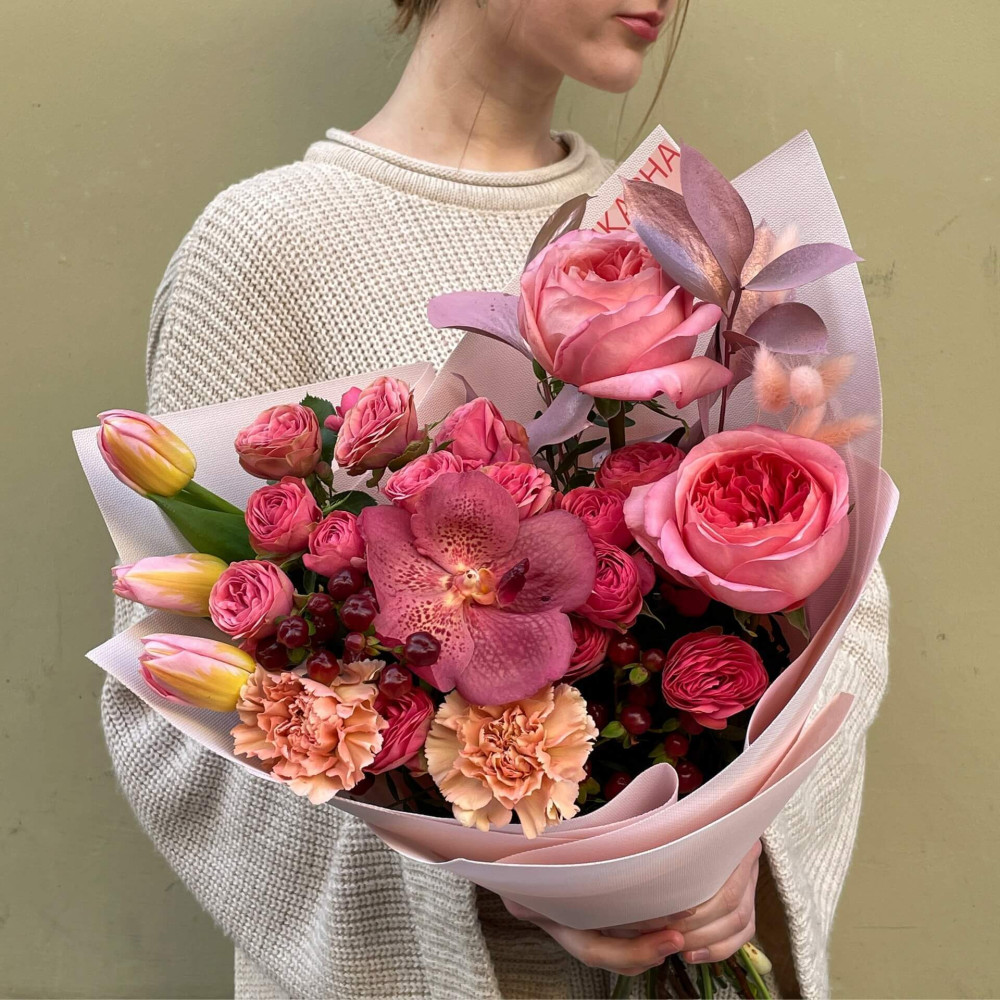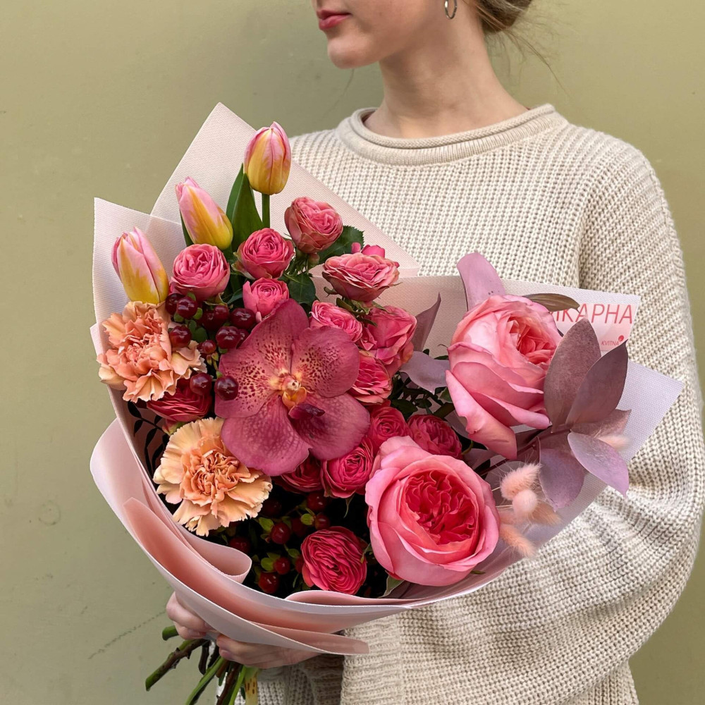 Квіти: Троянда піоновидна, Фаленопсис, Діантус, Тюльпан, Хіперикум, Рускус