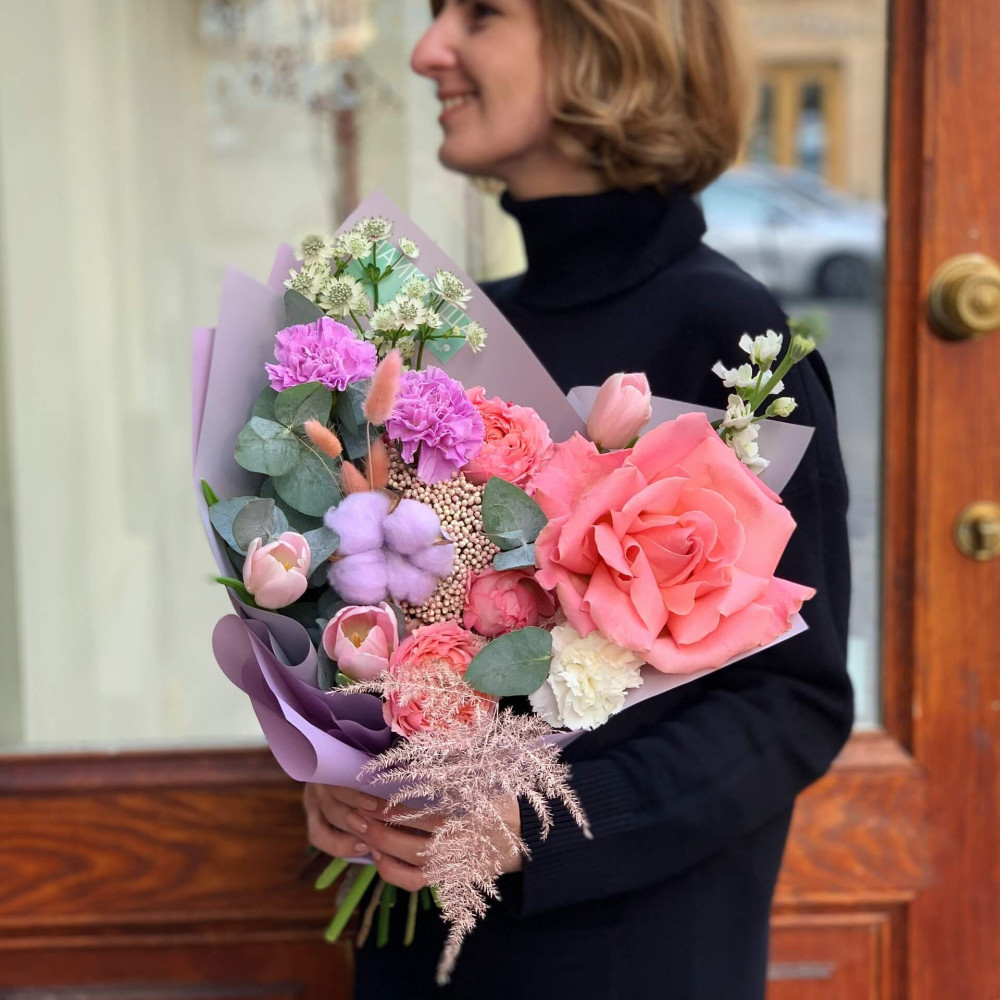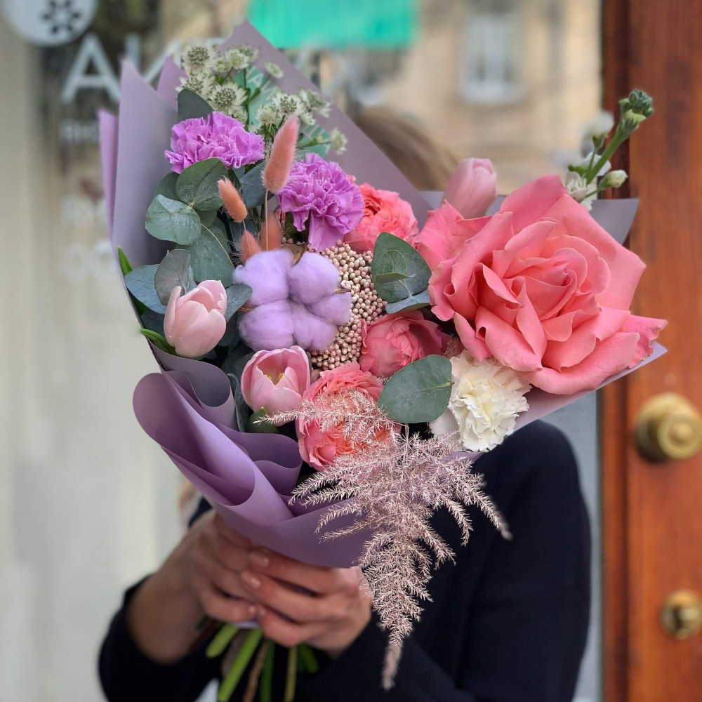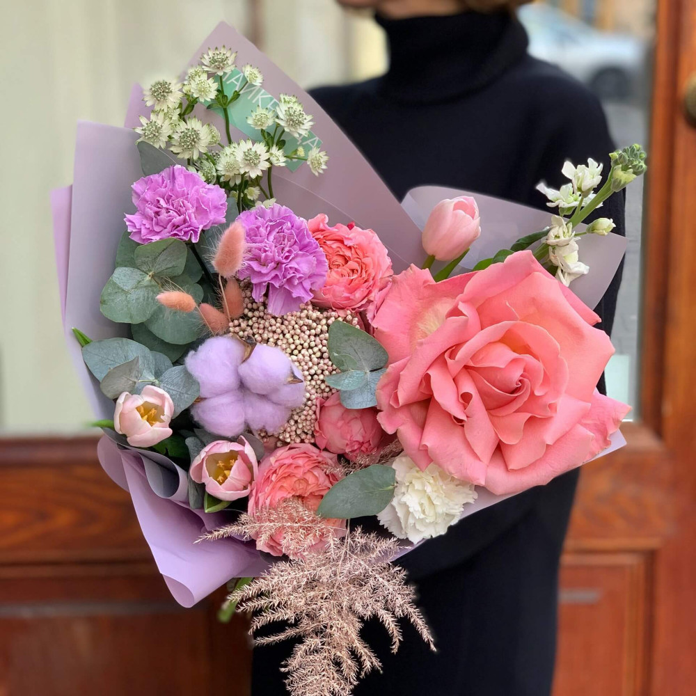 Квіти: Троянда, Троянда піоновидна, Діантус, Бавовна, Лагурус, Тюльпан, Матіола, Астранція, Евкаліпт