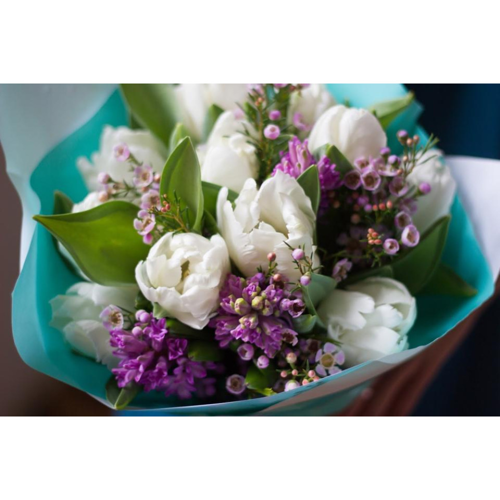 Ніжний весняний букет з гіацинтами і хамелаціумом