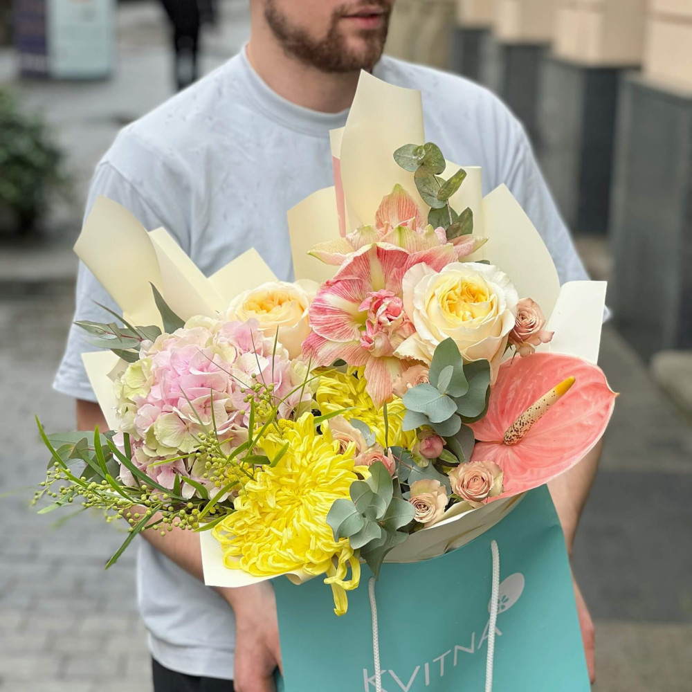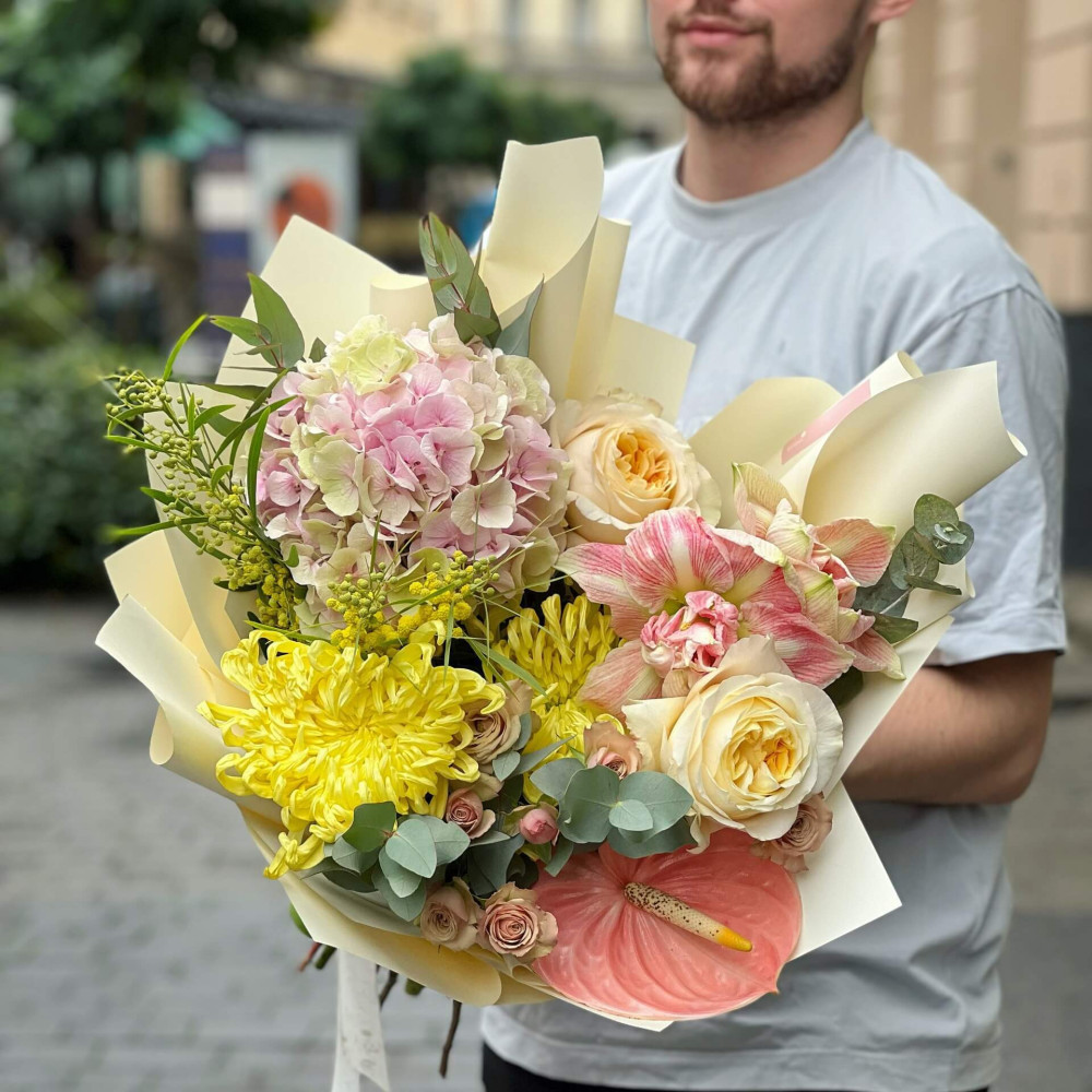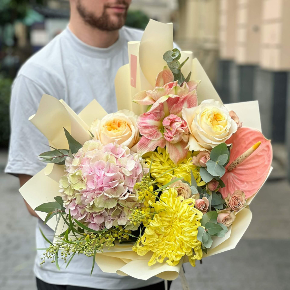 Квіти: Хризантема, Гортензія, Гіпеаструм, Троянда піоновидна, Мімоза, Антуріум, Евкаліпт, Троянда кущова
