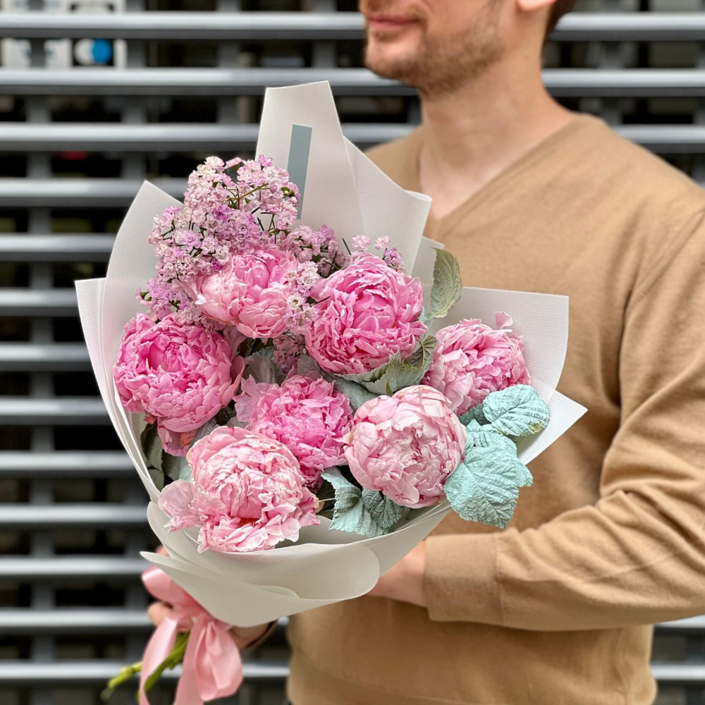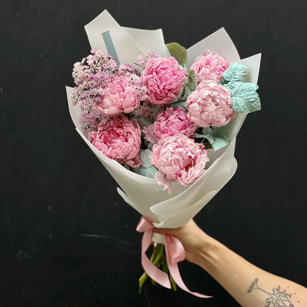 Квіти: Півонія, Хамелаціум, Малина (листя)