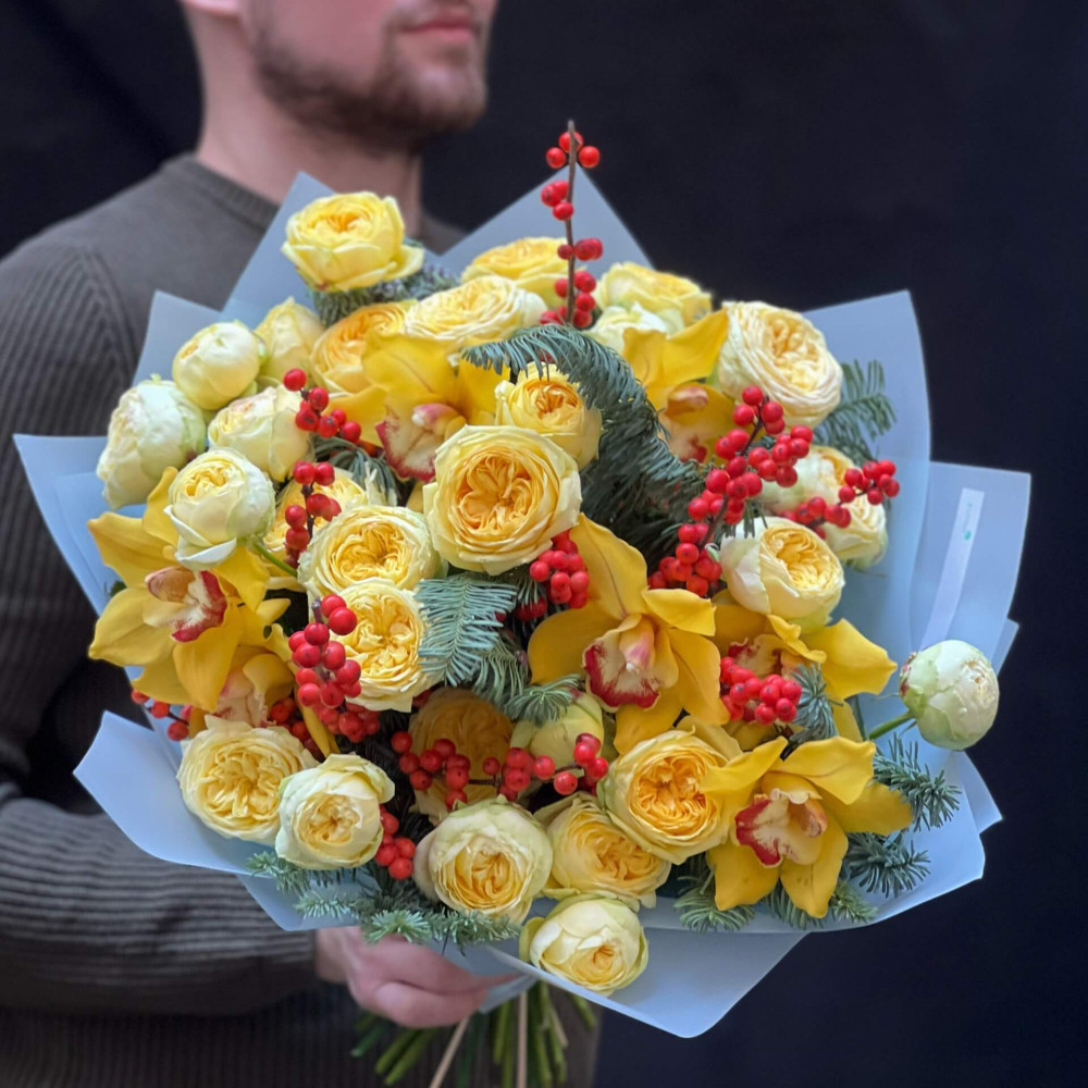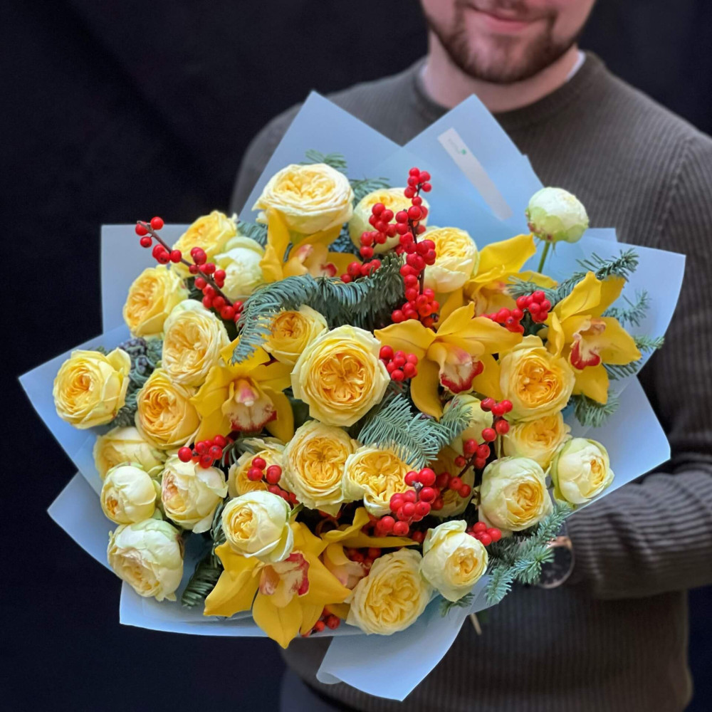 Зима буває сонячною та яскравою, варто лише бути поруч з Катрусею, яка променисто усміхається, тримаючи в руках цей букет. Запали сонечко взимку!