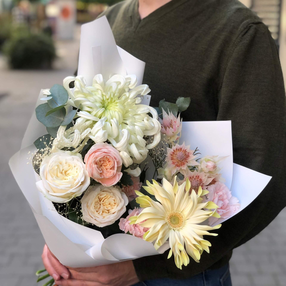 Квіти: Троянда піоновидна, Гербера, Серрурія, Діантус (Гвоздика), Хризантема