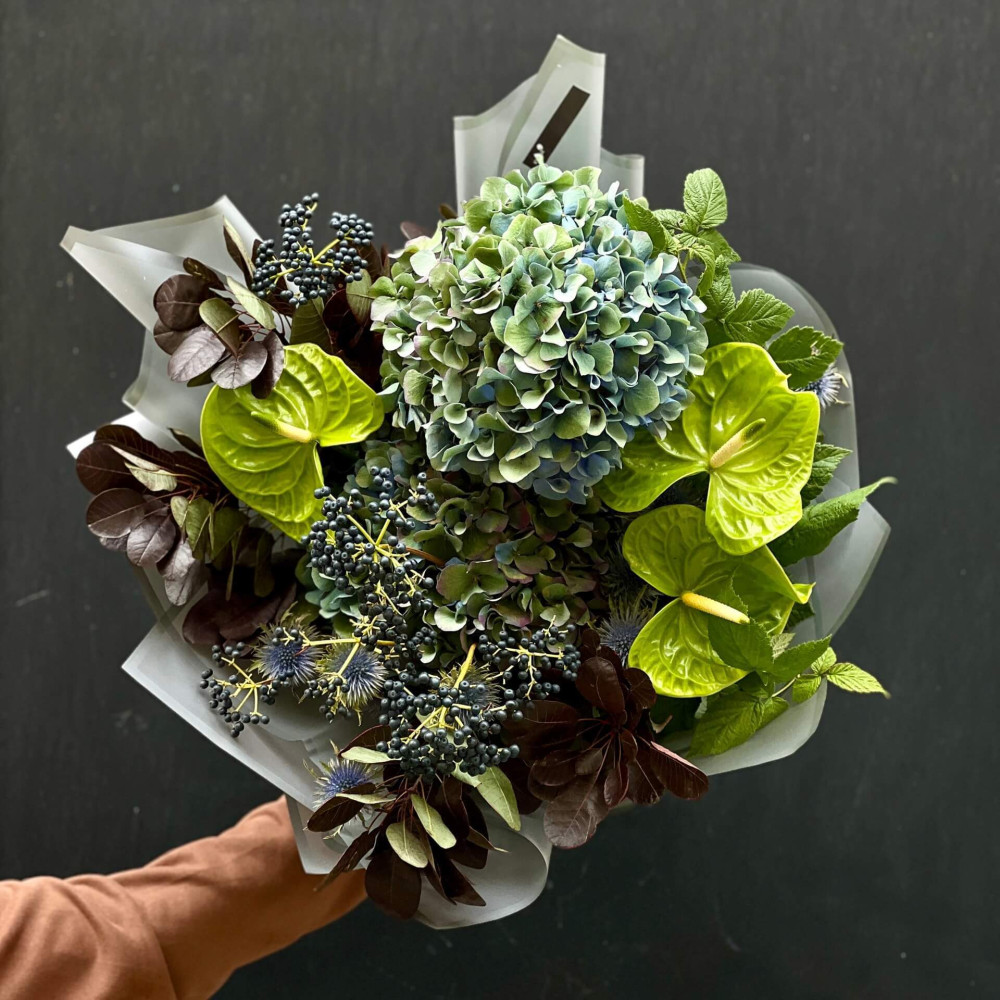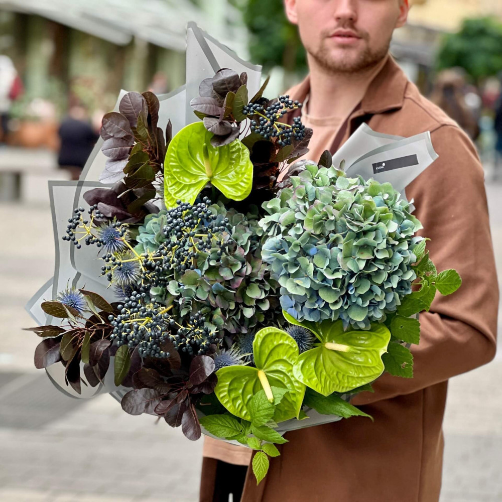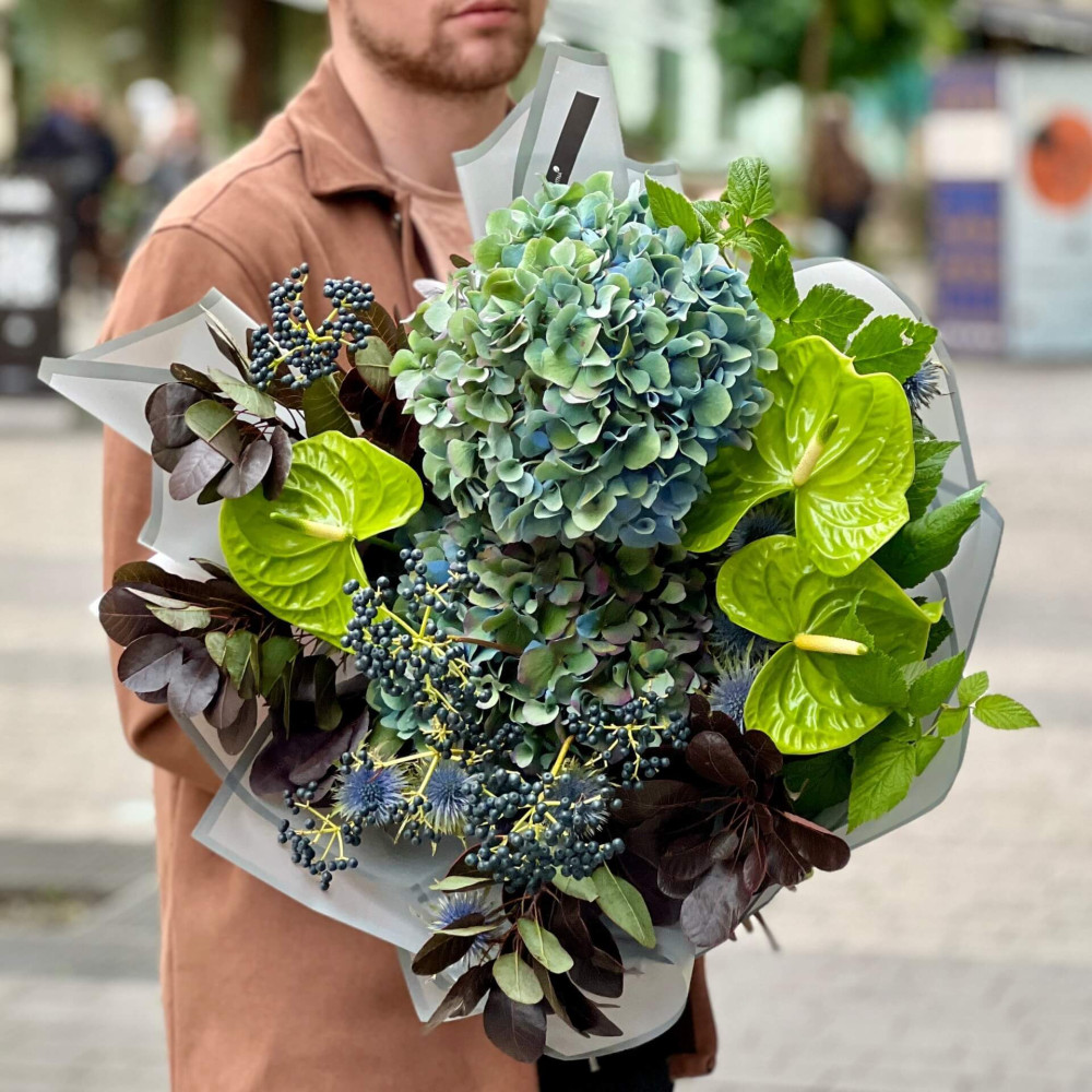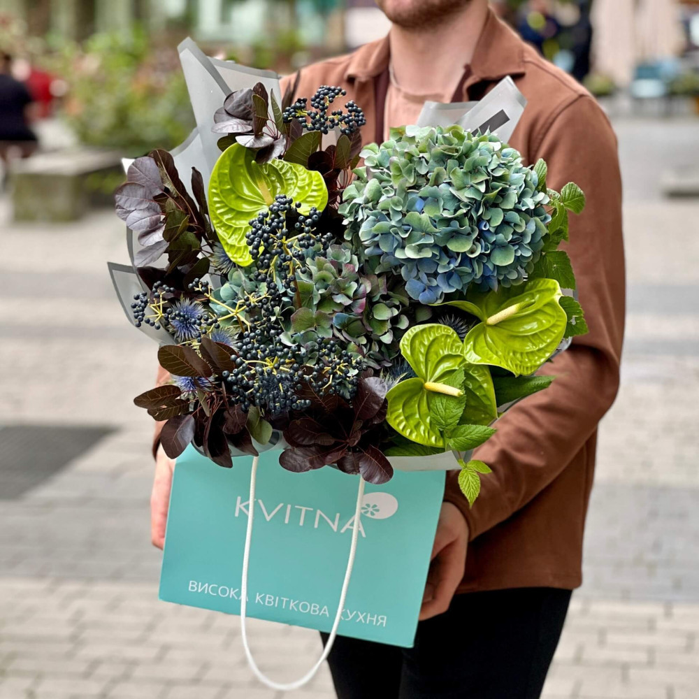 Глибокі сині і зелені відтінки, немов розкішне оперення неймовірно красивого птаха, який заворожує барвистим хвостом не тільки своїх пав, але й людей. Цей букет повинен приворожити тебе.