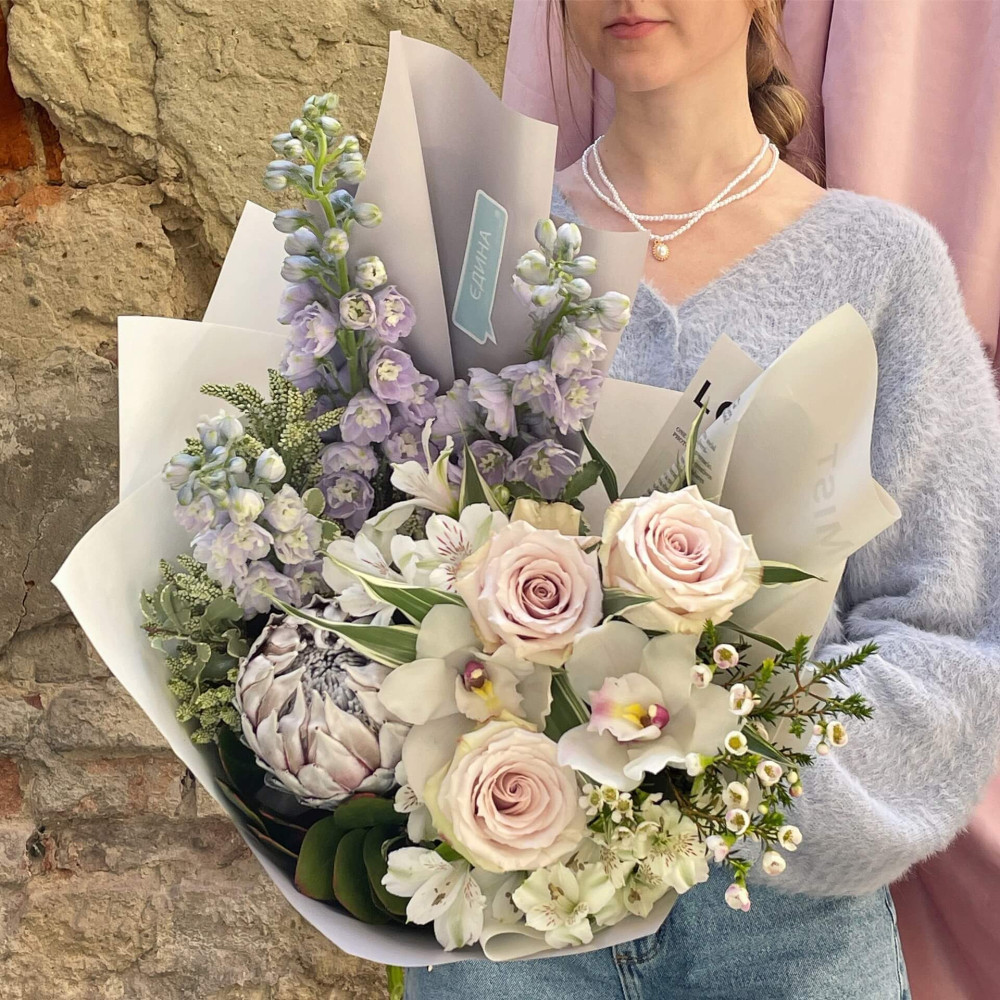 Квіти: Протея, Дельфініум, Троянда, Матіола, Вероніка, Альстромерія, Піттоспорум, Цимбідіум, Хамелаціум