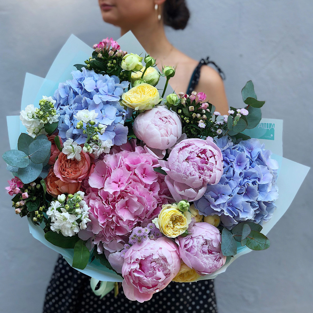 Квіти: Гортензія, Троянда піоновидна, Матіола, Бувардія, Евкаліпт, Айстра, Півонія