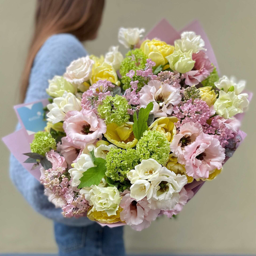 Квіти: Тюльпан, Еустома, Вібурнум, Бузок, Фрезія