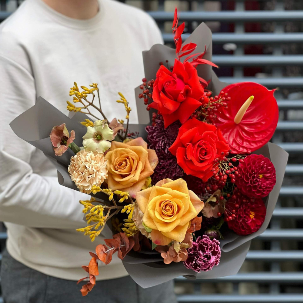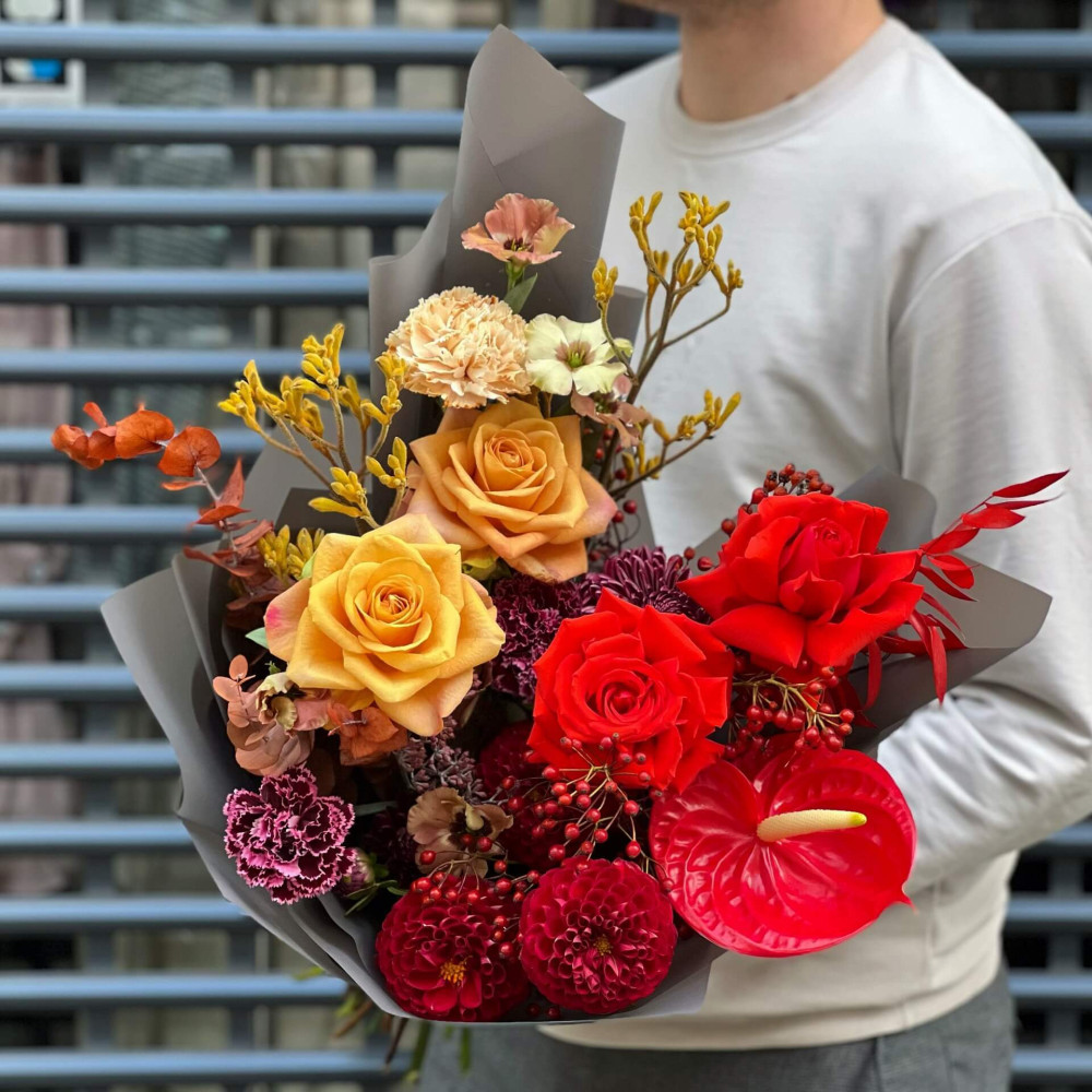 Квіти: Троянда, Еустома, Антуріум, Хризантема, Жоржина, Евкаліпт, Анігозантус, Шипшина