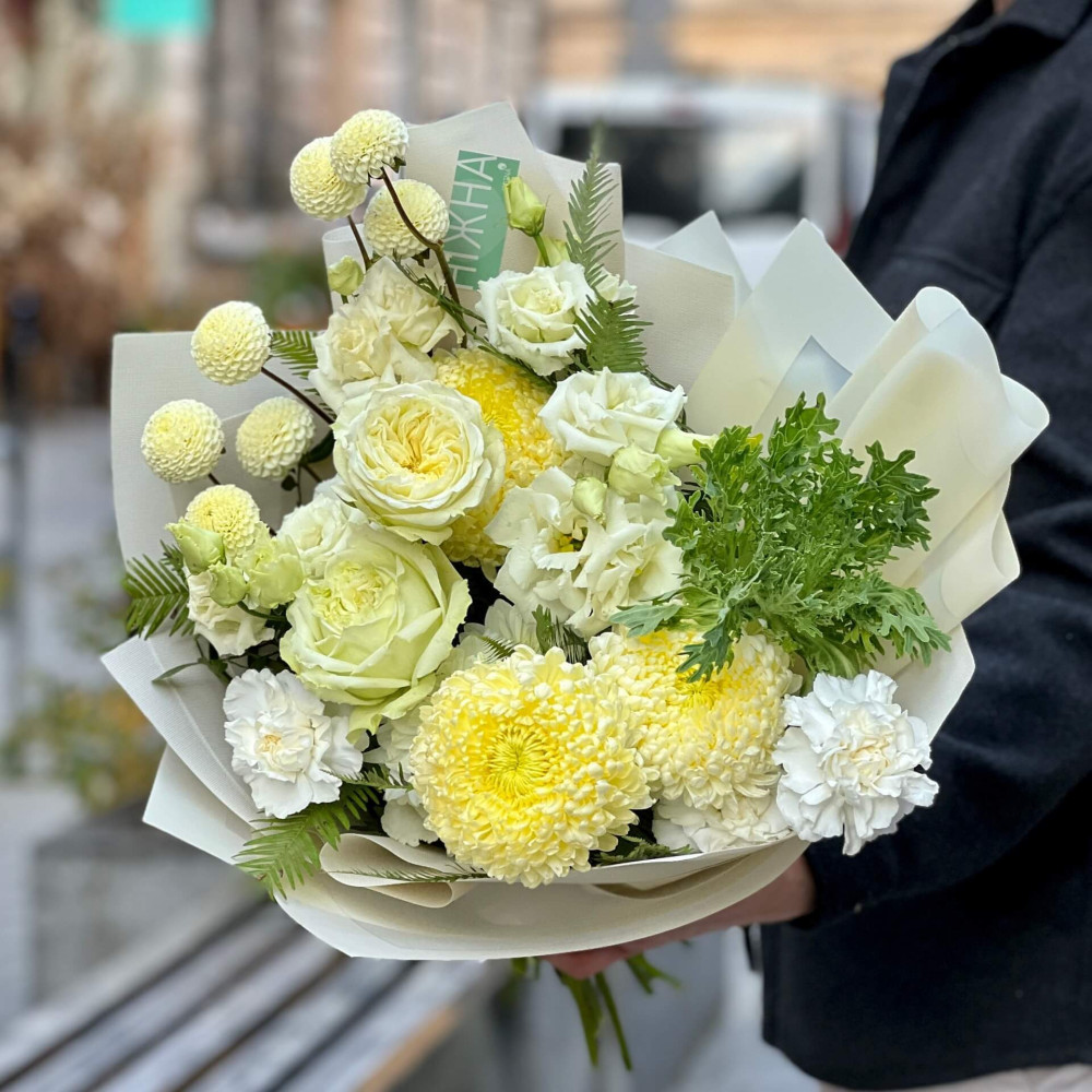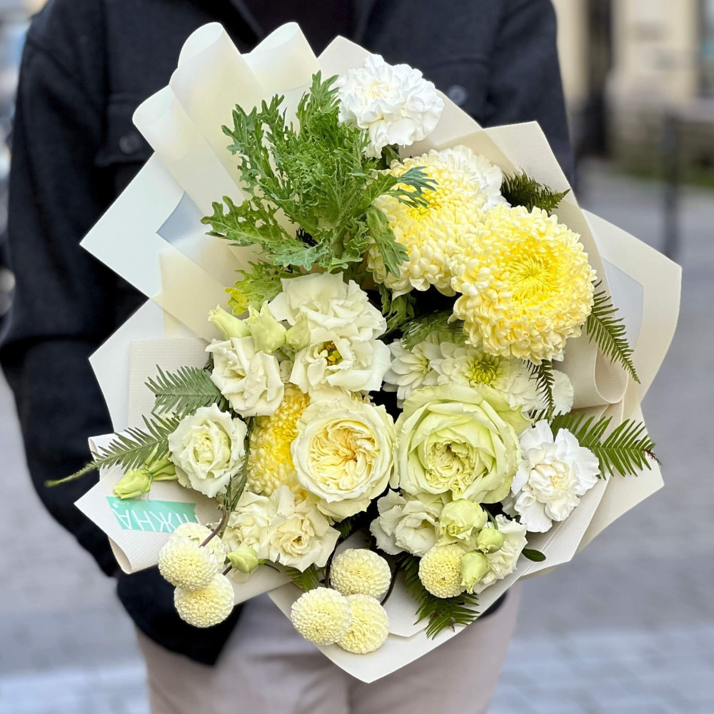 Залежно від сезонності і наявності квітів ми залишаємо за собою право змінювати склад букета без повідомлення замовника, зберігаючи при цьому авторський стиль, колірне рішення, концепцію букета. У разі, якщо необхідна заміна базової квітки, заміна відбувається з узгодженням із замовником. Якщо для Вас критично важлива присутність в складі певної квіточки – обов'язково зв'яжіться з нами та повідомте про це.