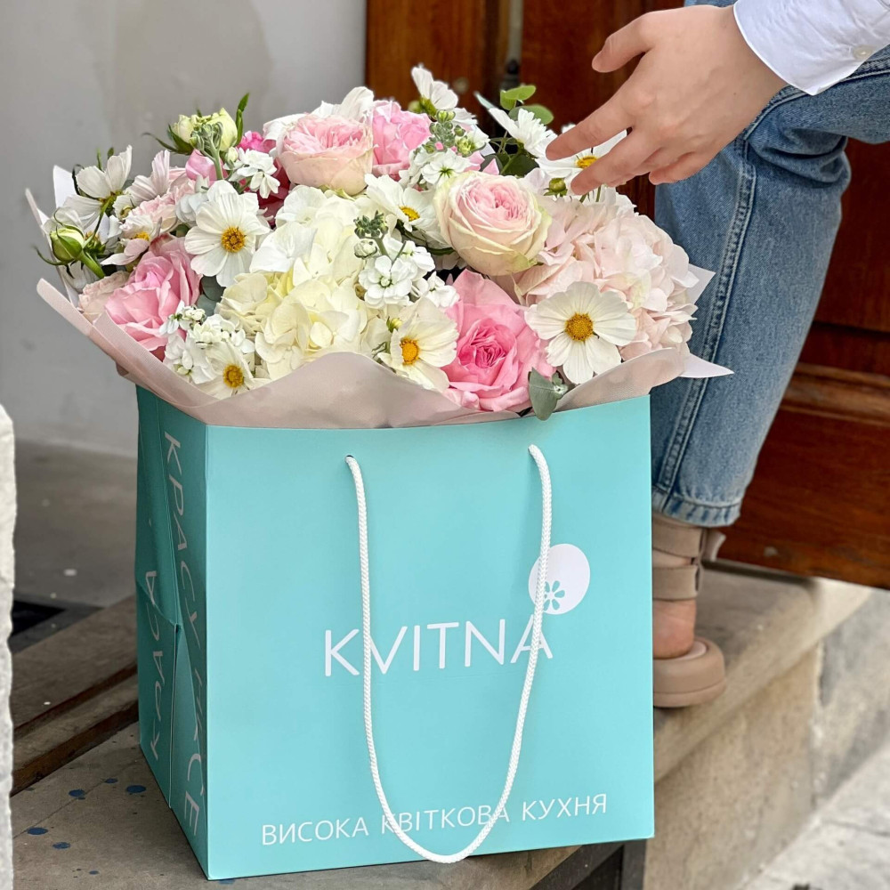 - Букети від Kvitna доставляються у фірмовому пакуванні, яке потрібно зняти при установці квітів у вазу. Не зрізайте стрічку, звʼязуючу букет, щоб зберегти його форму.