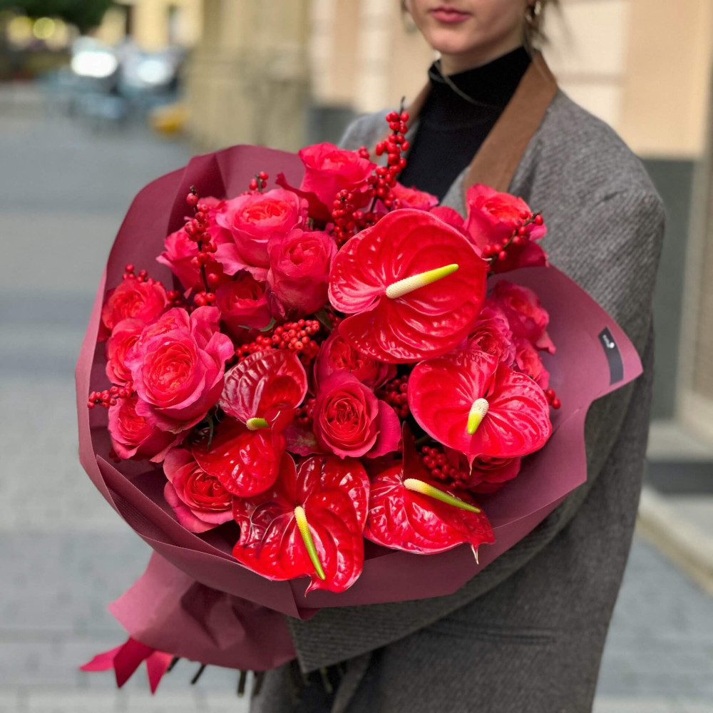 Квіти: Троянда піоновидна, Ілекс, Антуріум