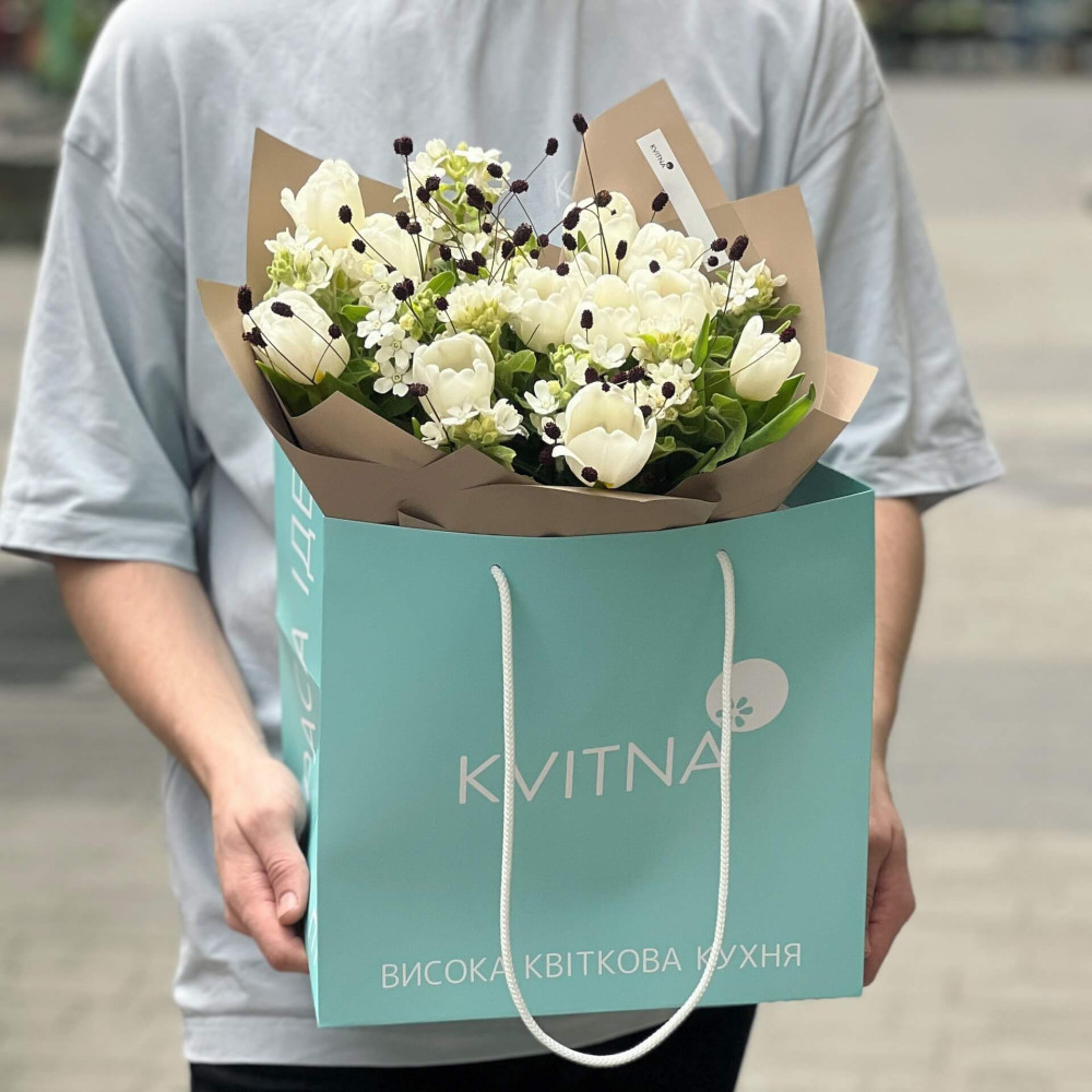 Соковиті хрумкі білосніжні тюльпани з рубіновими краплями родовика та діамантовими зірочками оксипеталуму. Незвичне та легке елегантне поєднання, яке представляє тюльпани в новому звучанні.