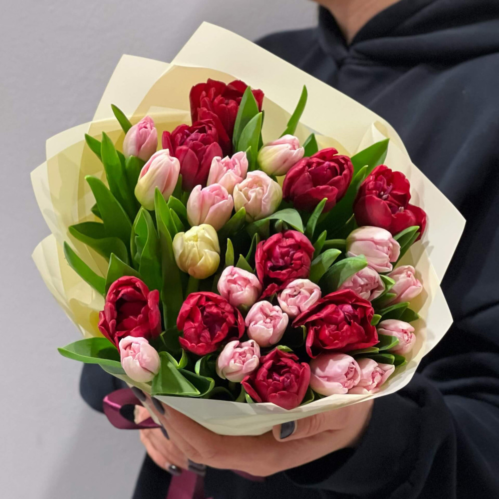 - Ми радимо знімати упаковку з букета і ставити букет в вазу в тій спіральній техніці, яку зробив флорист, тоді букет буде тримати гарну форму і тюльпан дасть свій природній вигин і красиве розкриття.