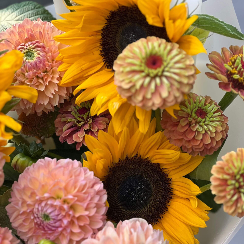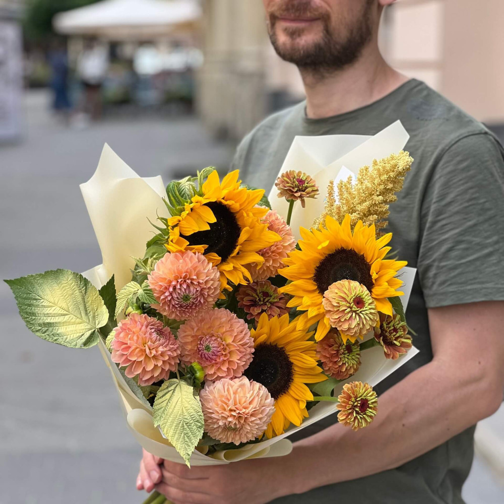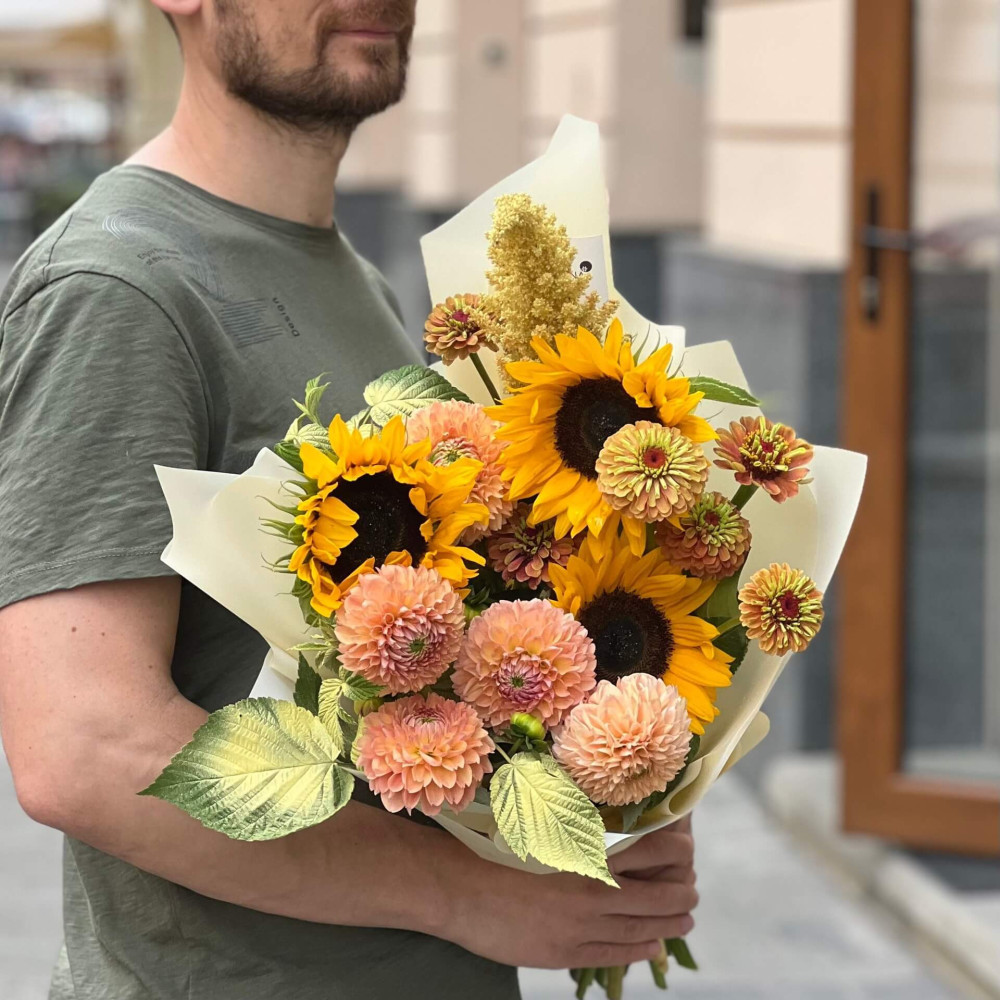 - Як замовити Букет у теплих відтінках із соняшниками «Серпневе натхнення»? ❯