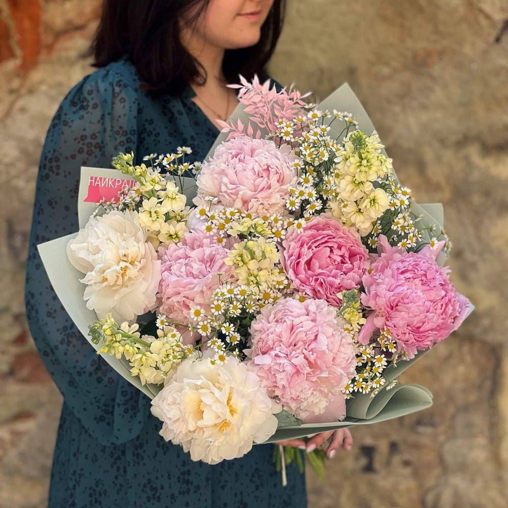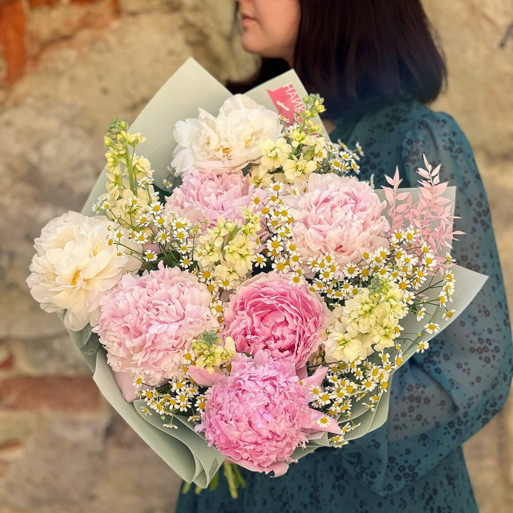 Квіти: Півонія, Танацетум, Матіола, Рускус