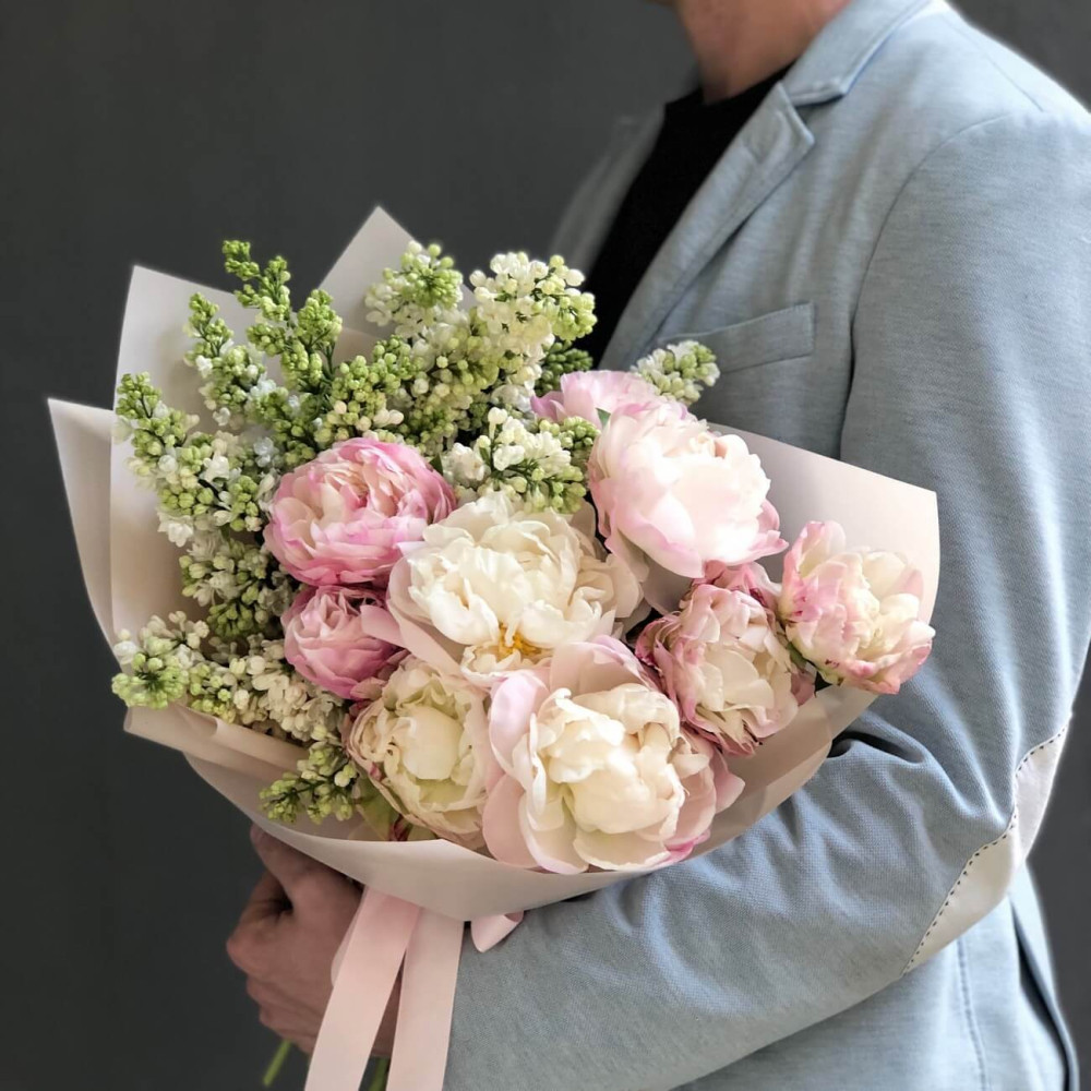 Букет з рожевими піонами та білим бузком