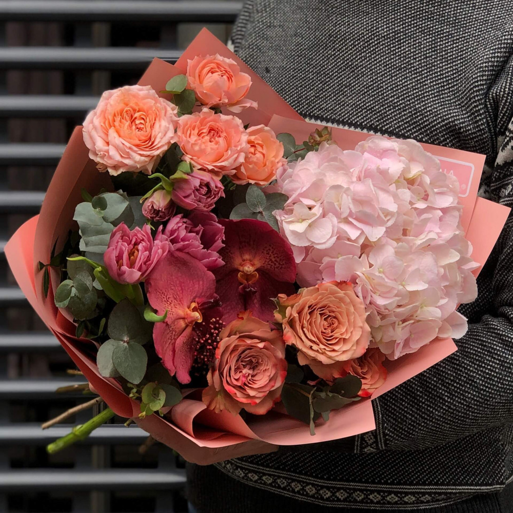 Квіти: Троянда, Гортензія, Троянда піоновидна, Скімія, Тюльпан, Евкаліпт