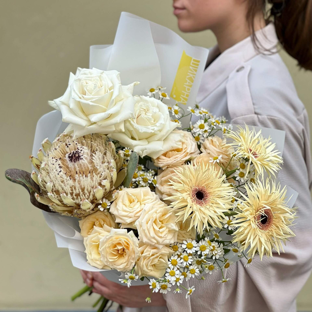 Квіти: Протея, Троянда кущова, Троянда, Гербера, Хамелаціум, Танацетум