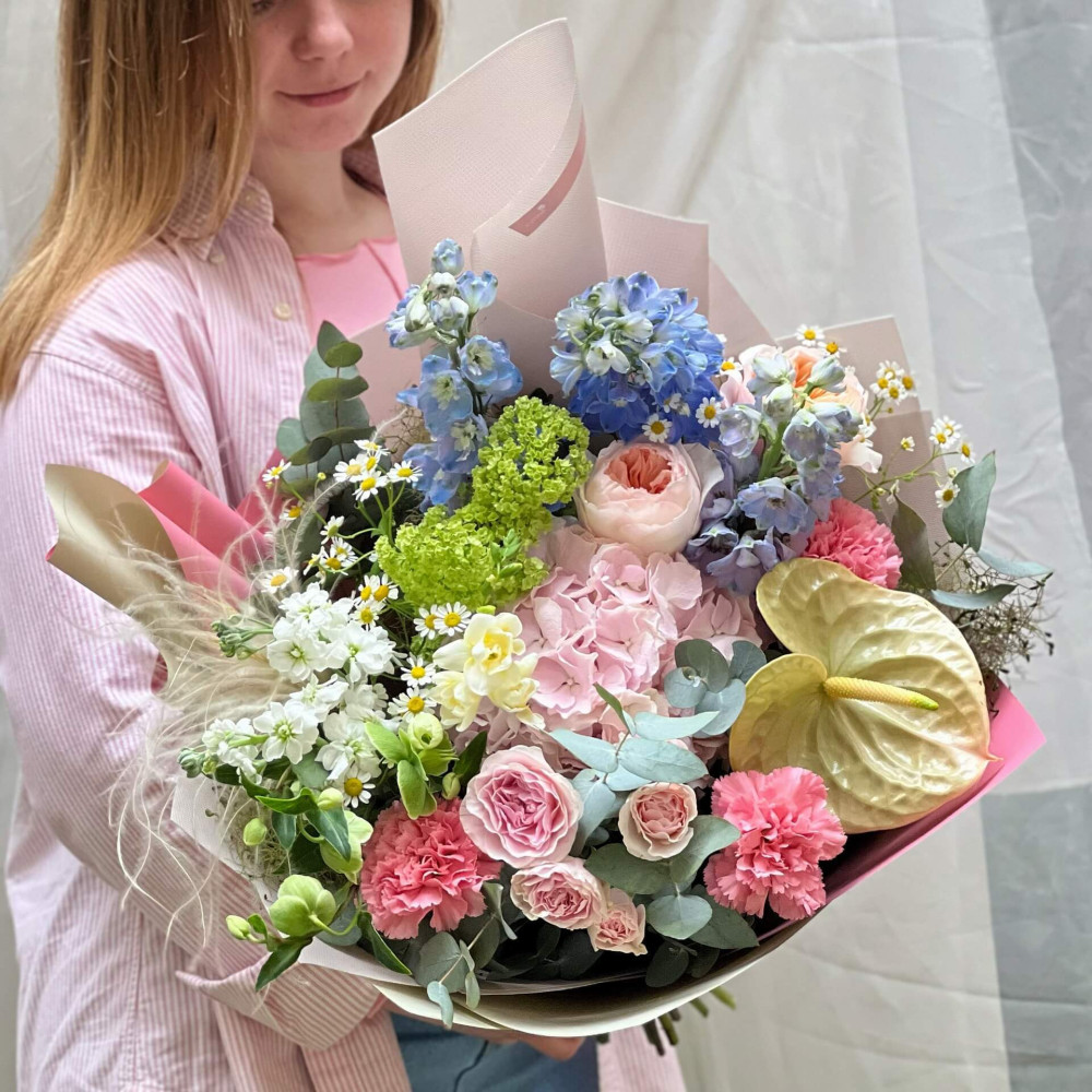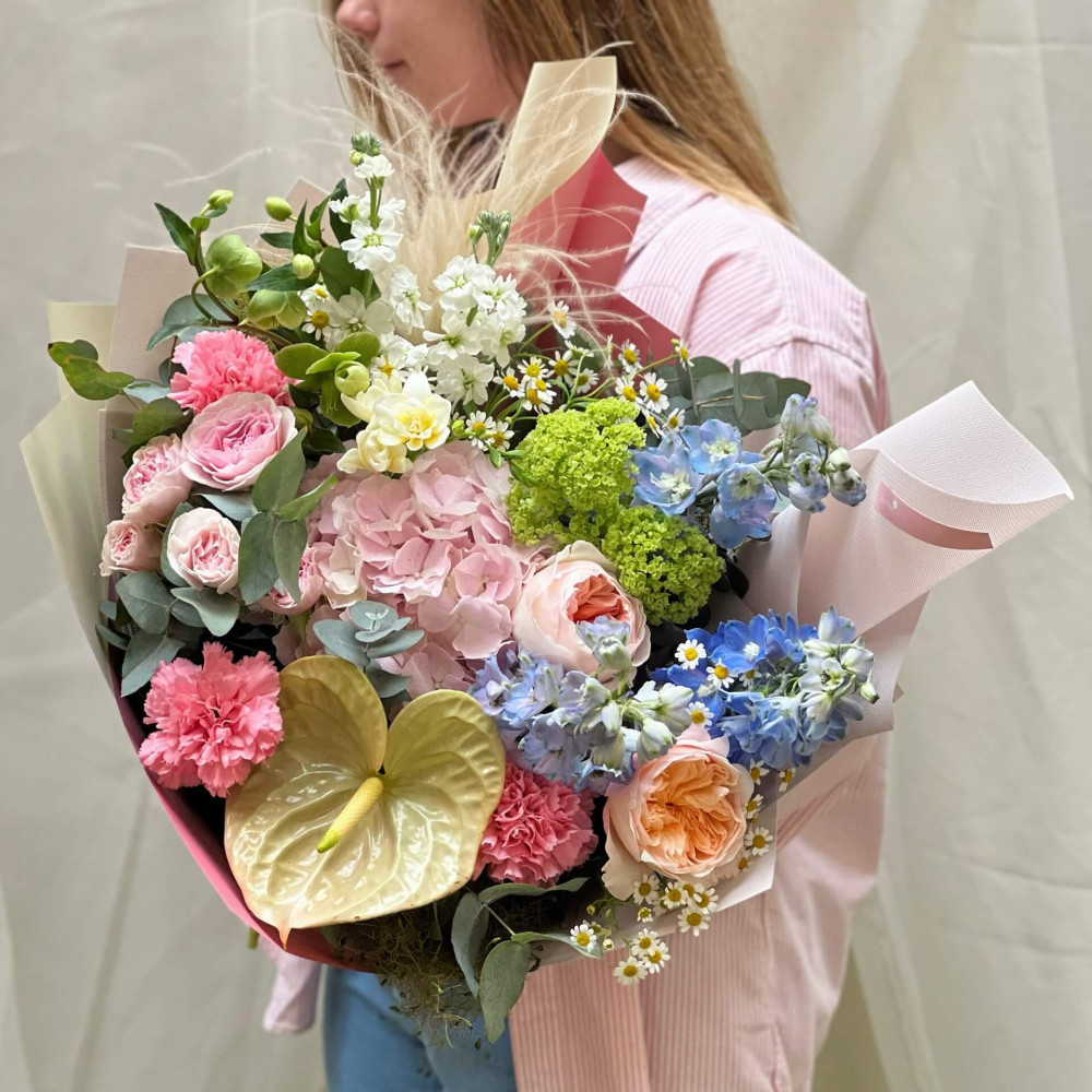 Квіти: Гортензія, Троянда піоновидна, Дельфініум, Матіола, Діантус, Антуріум, Танацетум, Хелеборус, Фрезія, Стіфа, Евкаліпт