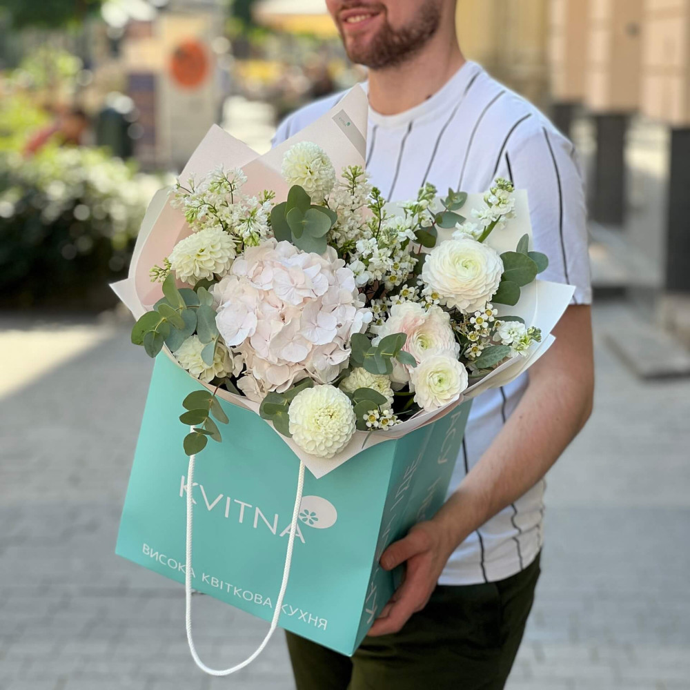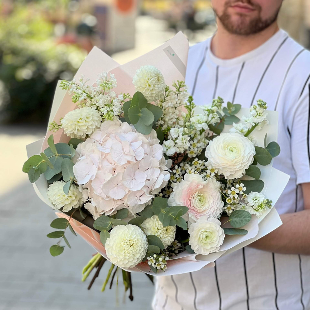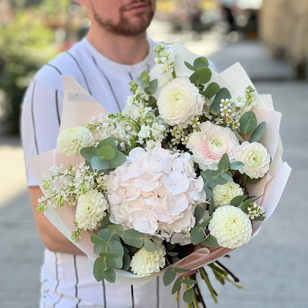 Квіти: Гортензія, Жоржина, Бузок, Ранункулюс, Хамелаціум, Матіола, Евкаліпт