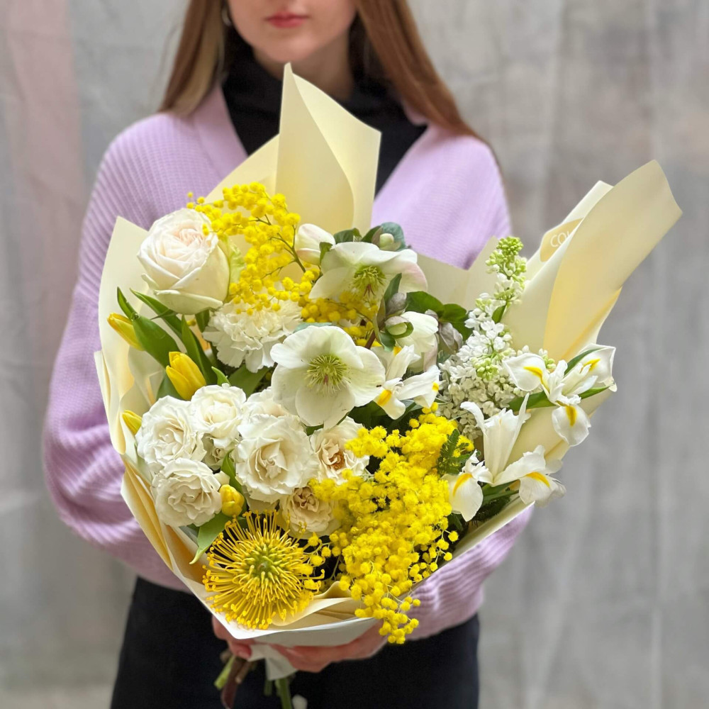 Квіти: Мімоза, Троянда піоновидна, Хелеборус, Троянда кущова, Ірис, Бузок, Тюльпан, Леукоспермум, Діантус