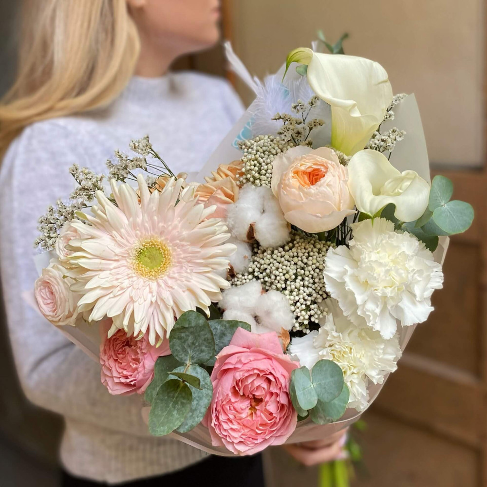 Квіти: Троянда піоновидна, Бавовна, Гербера, Діантус, Евкаліпт, Озотамнус, Зантедескія, Кермек