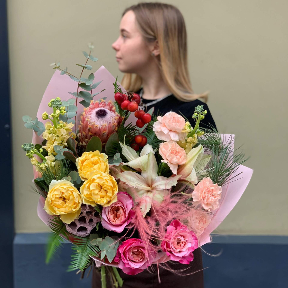 Квіти: Протея, Троянда піоновидна, Гіпеаструм, Матіола, Амбрела, Нелюмбо, Діантус