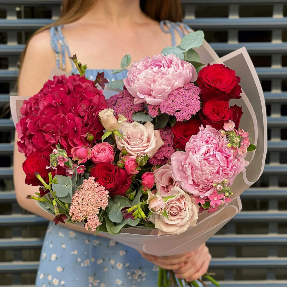 Квіти: Гортензія, Троянда, Ахілея, Півонія, Троянда піоновидна, Евкаліпт, Троянда кущова, Оксіпеталум