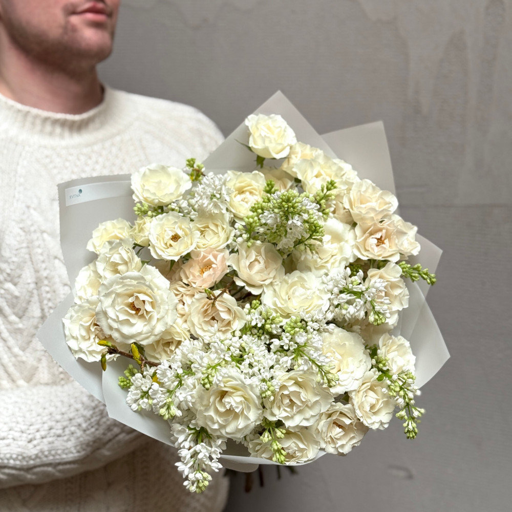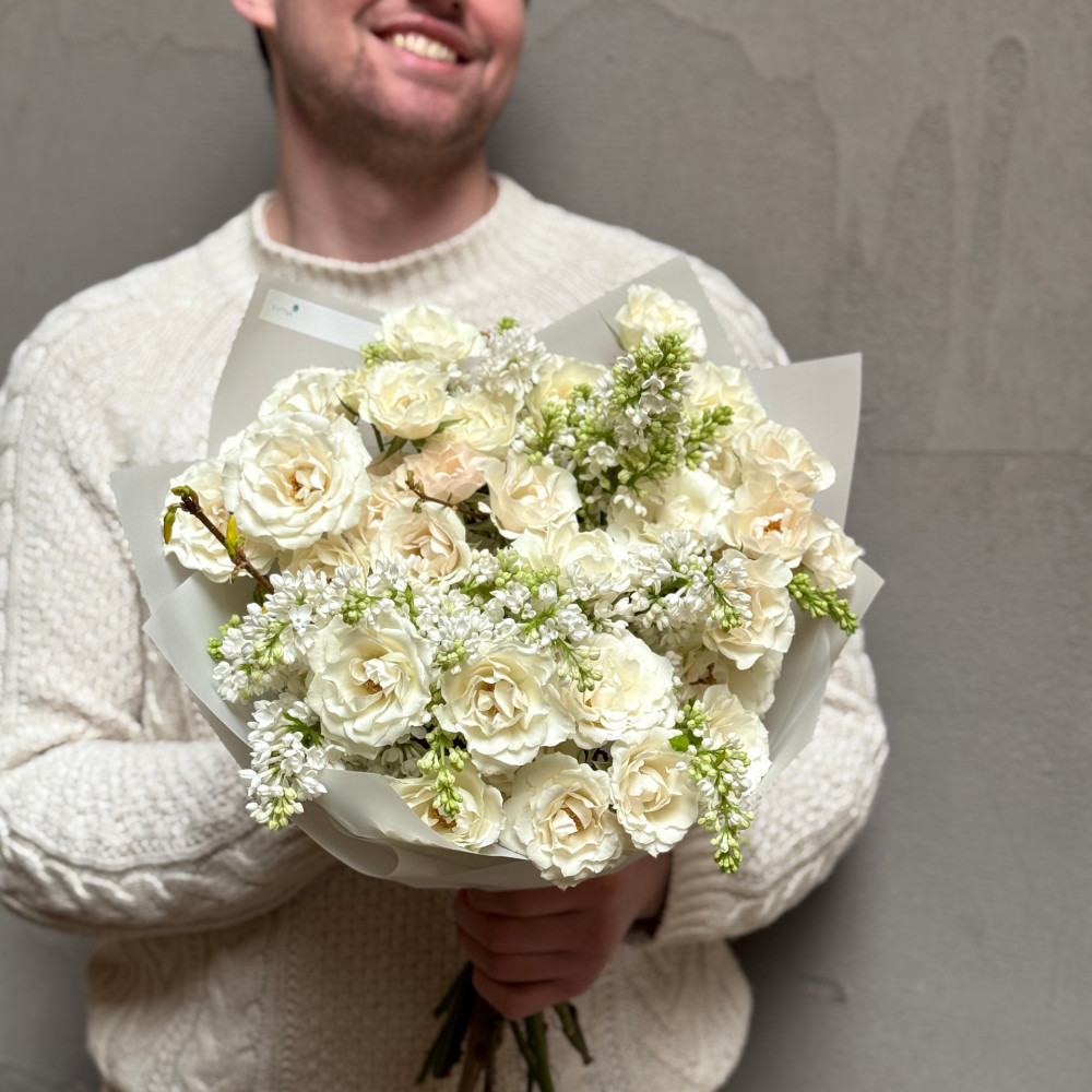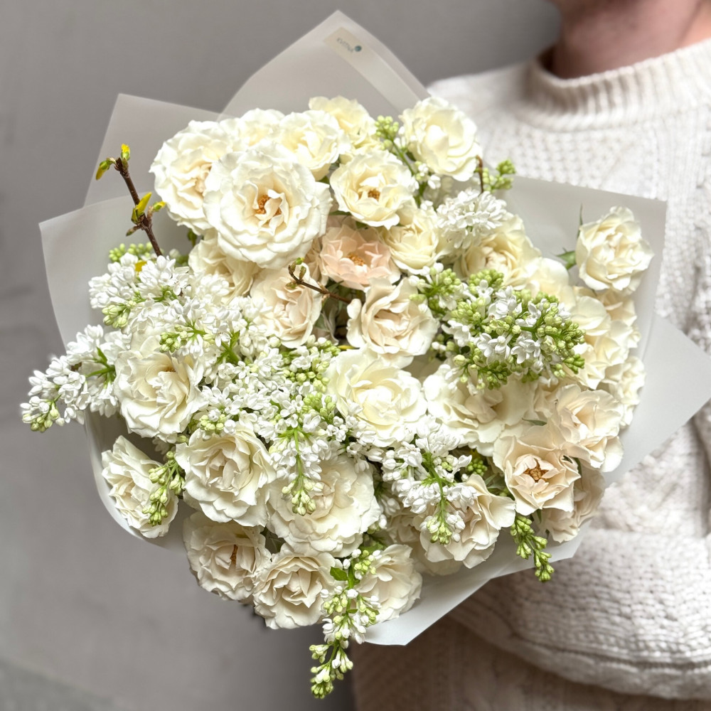 - Як замовити Букет з ароматним бузком та кущовою трояндою White Majolika «Повітряна меренга»? ❯
