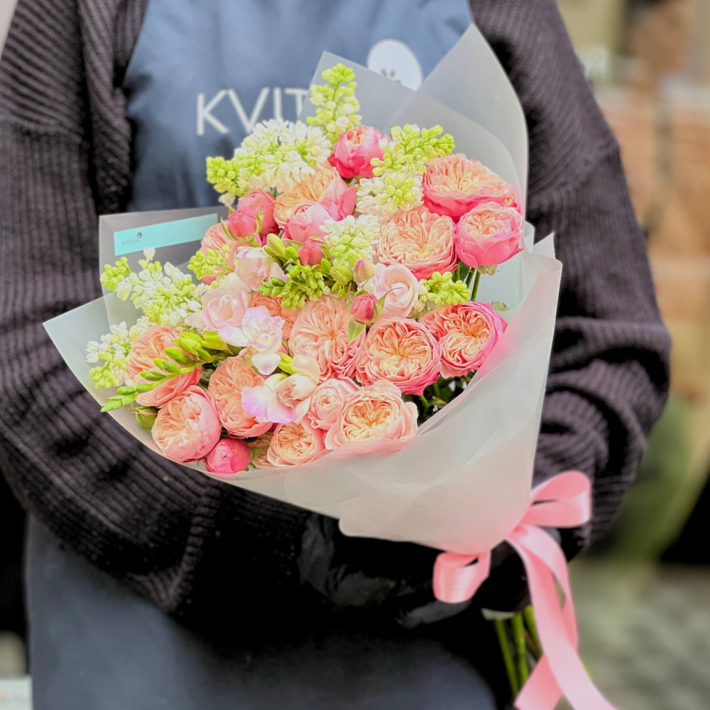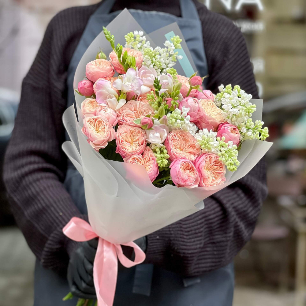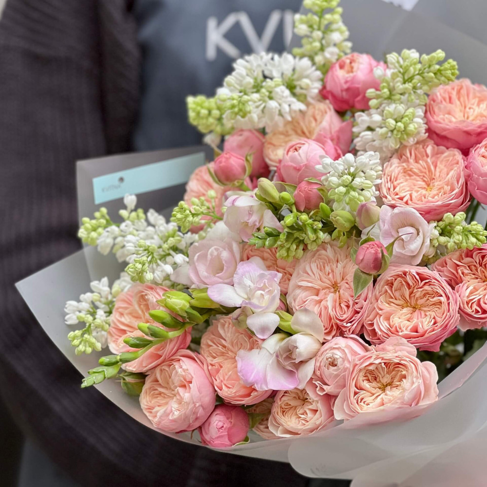 Букет, немов зібраний у своєму садку – чудові кущові півонієподібні троянди, ніжно-фіалкова запашна фрезія та китички білого бузку. Комплімент для неї, єдиної.