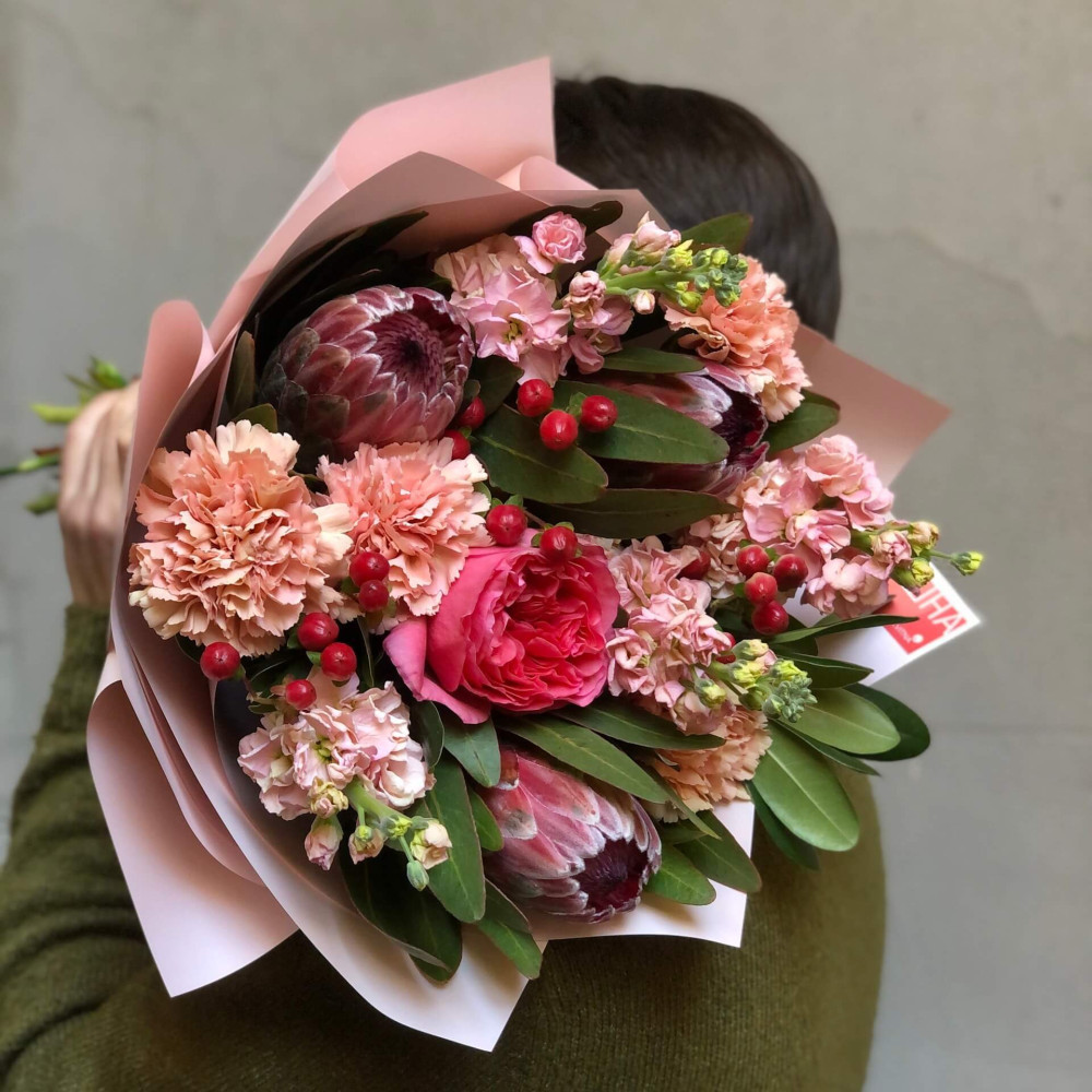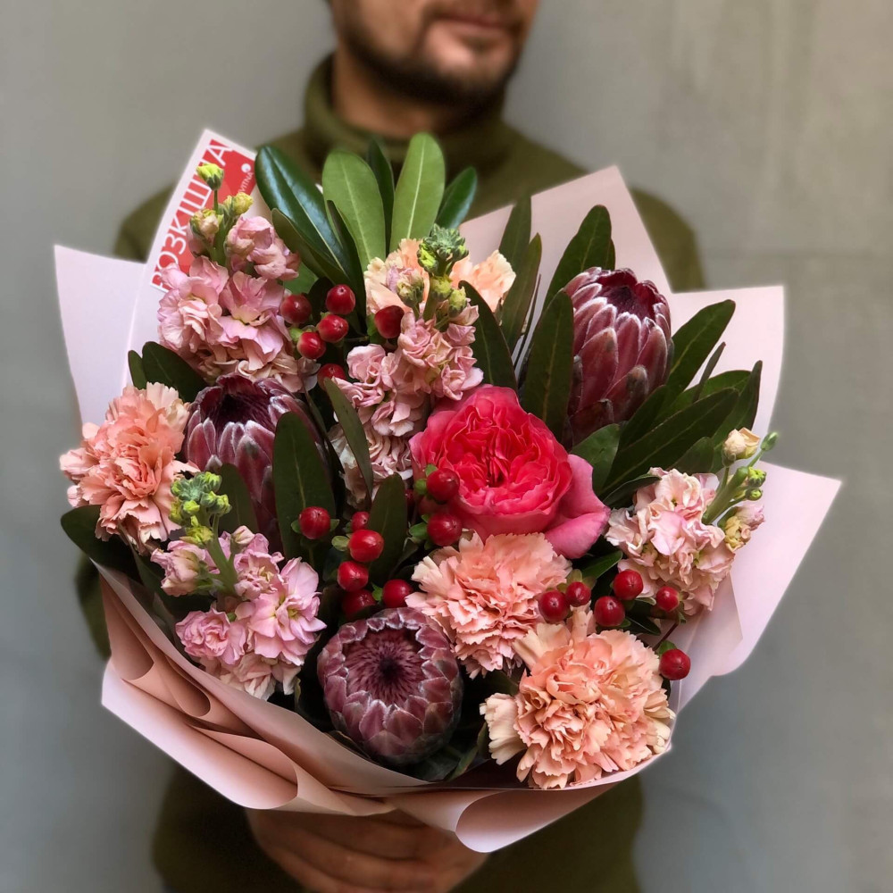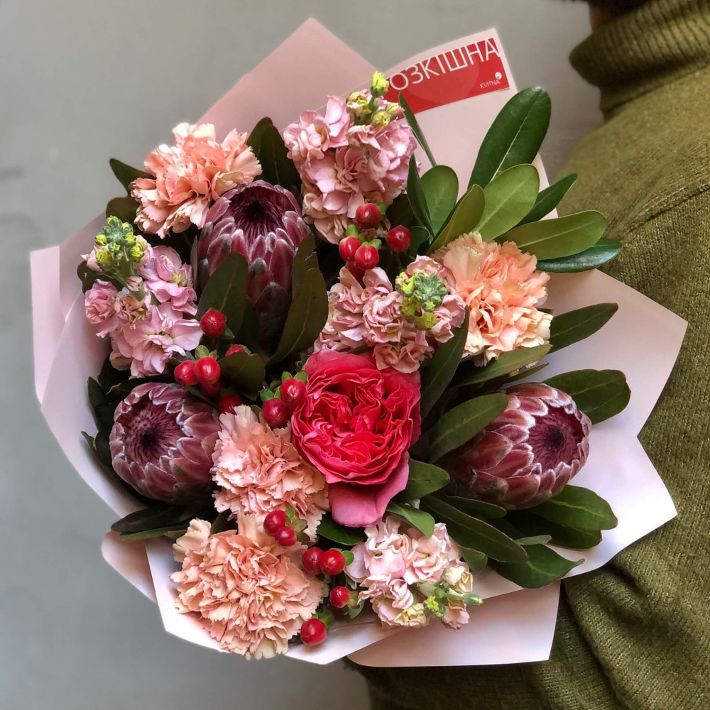 Квіти: Протея, Троянда піоновидна, Матіола, Діантус (Гвоздика), Піттоспорум, Хіперикум