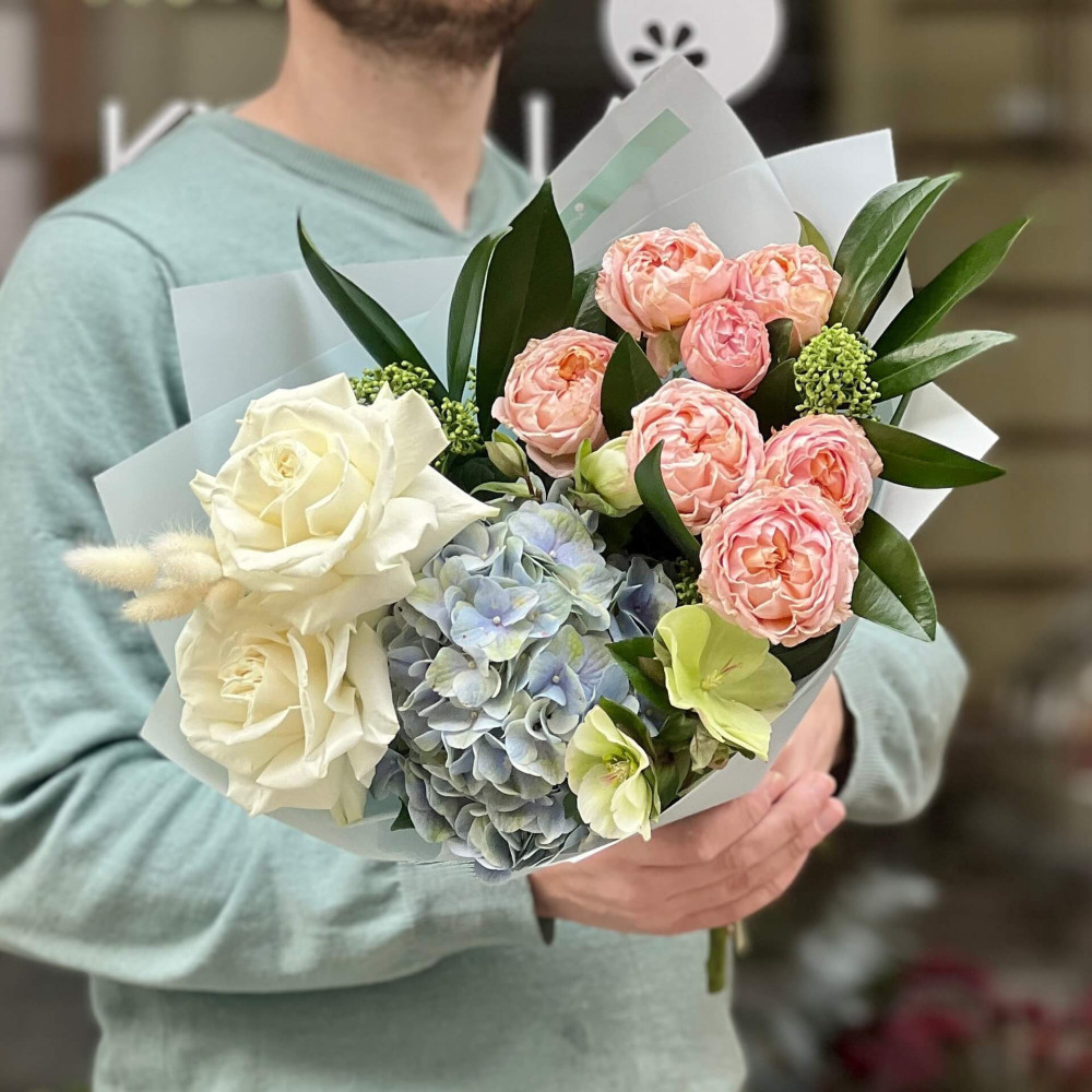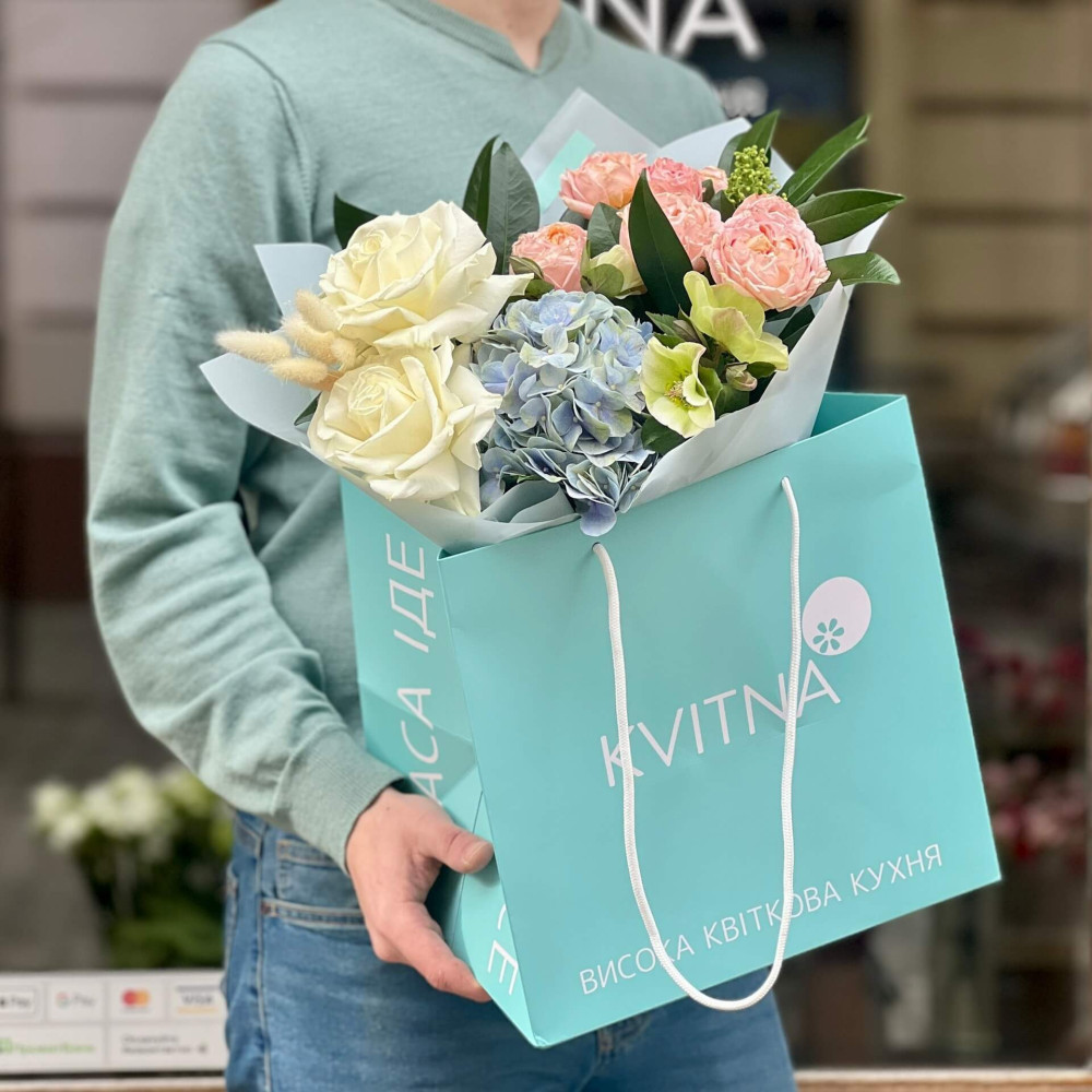 - Як замовити Букет з гортензією та півонієподібними трояндами «Акварельні хвилі»? ❯