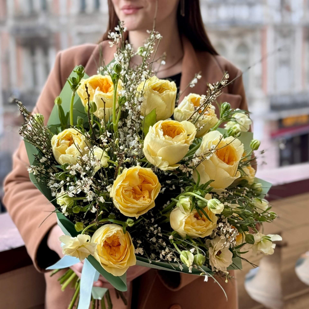 - Як замовити Букет з піоновидною кремовою трояндою та ранункулюсом Butterfly «Сонячні метелики»? ❯