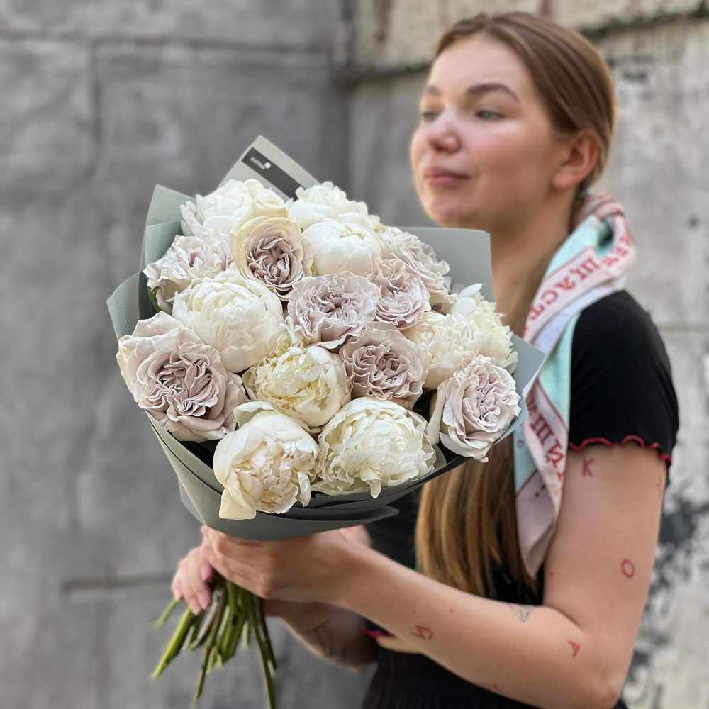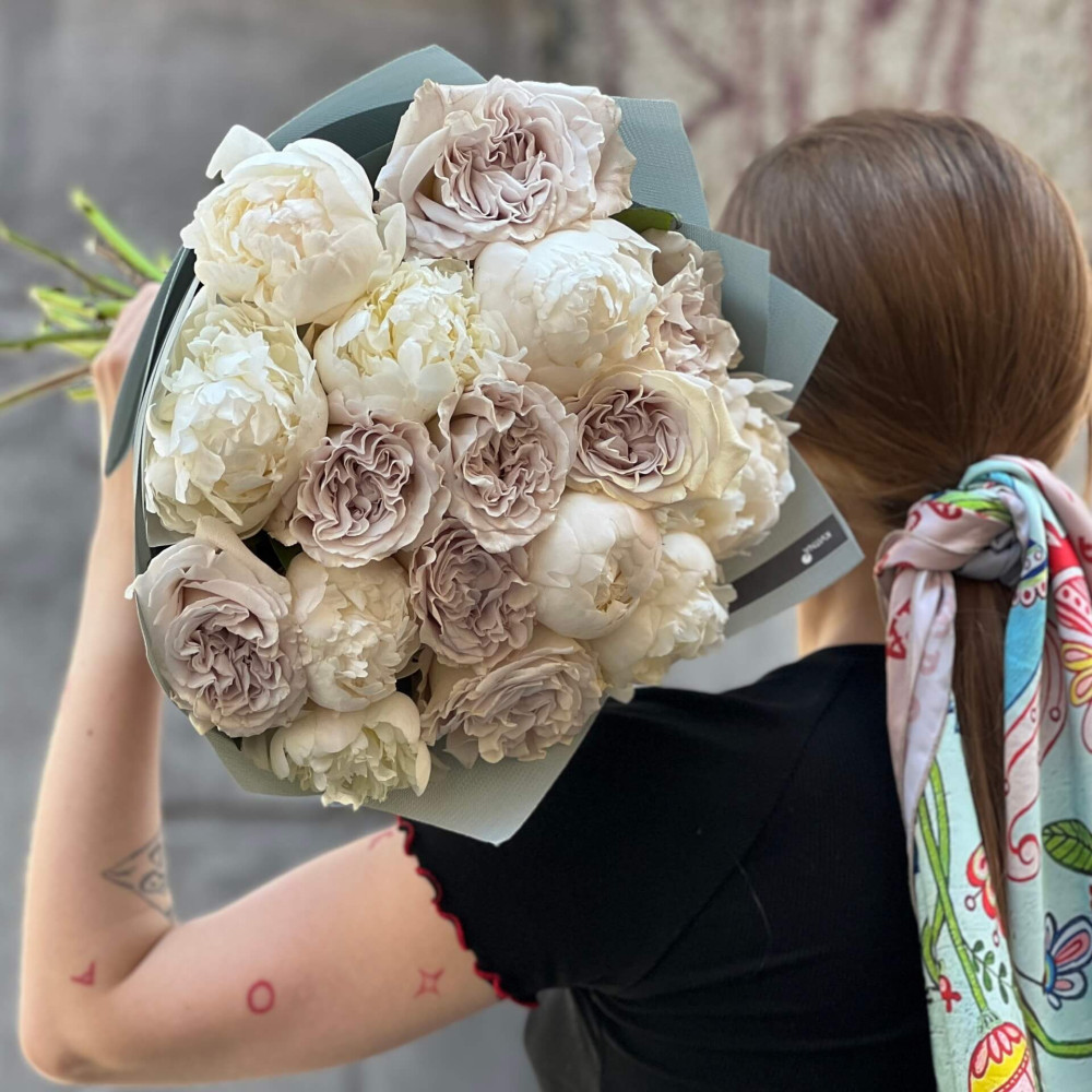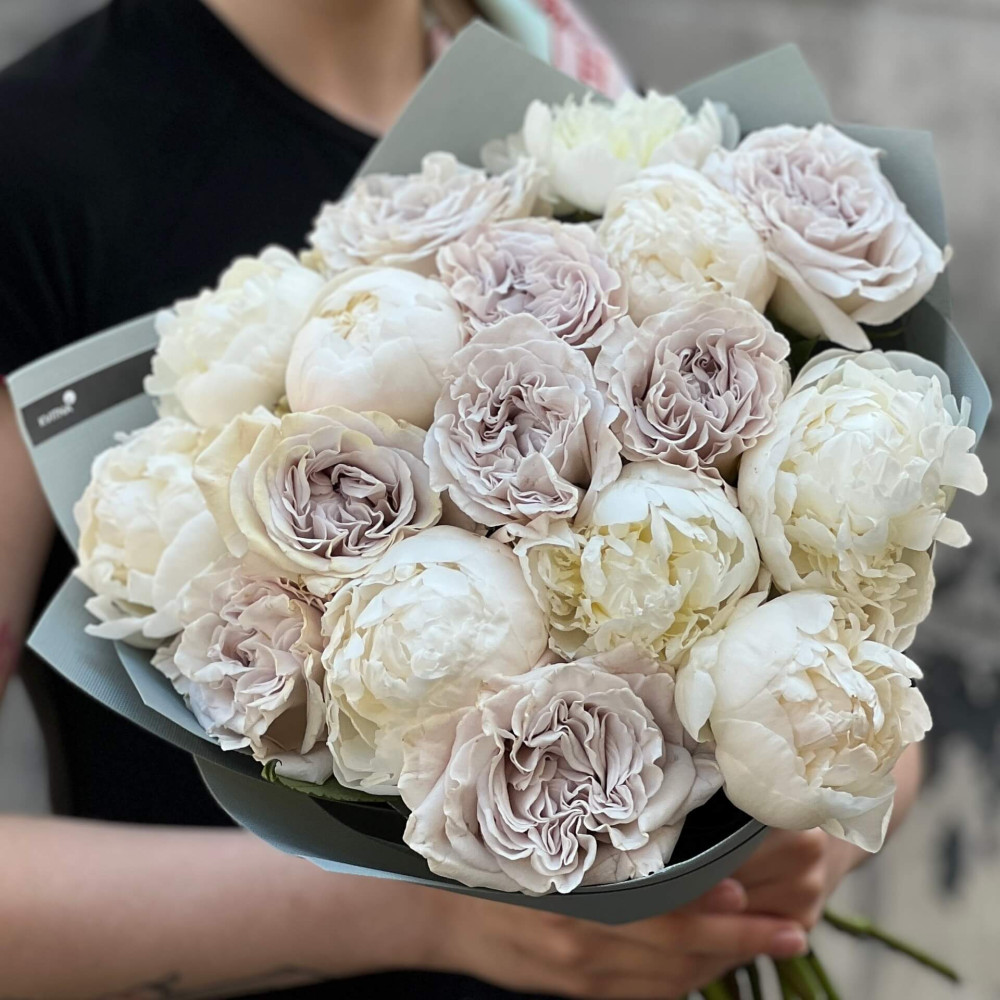- Як замовити Букет з півоніями та трояндами сорту Westminster Abbey «Мереживне королівство»? ❯