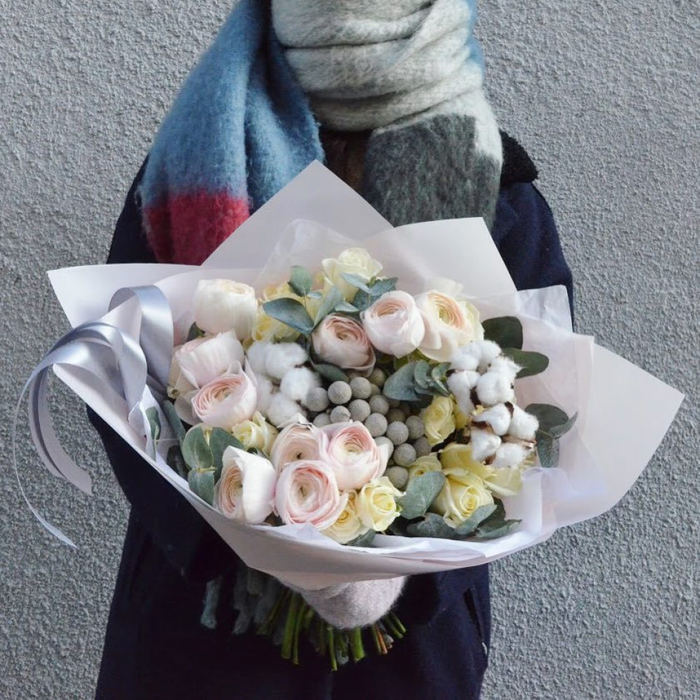 - Як замовити Букет з ранункулюсами та бавовною «Квітуча зима»? ❯
