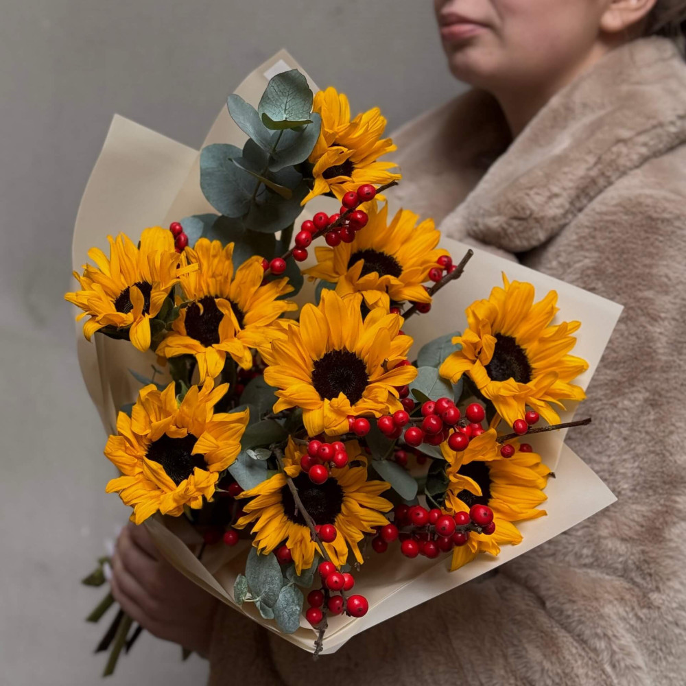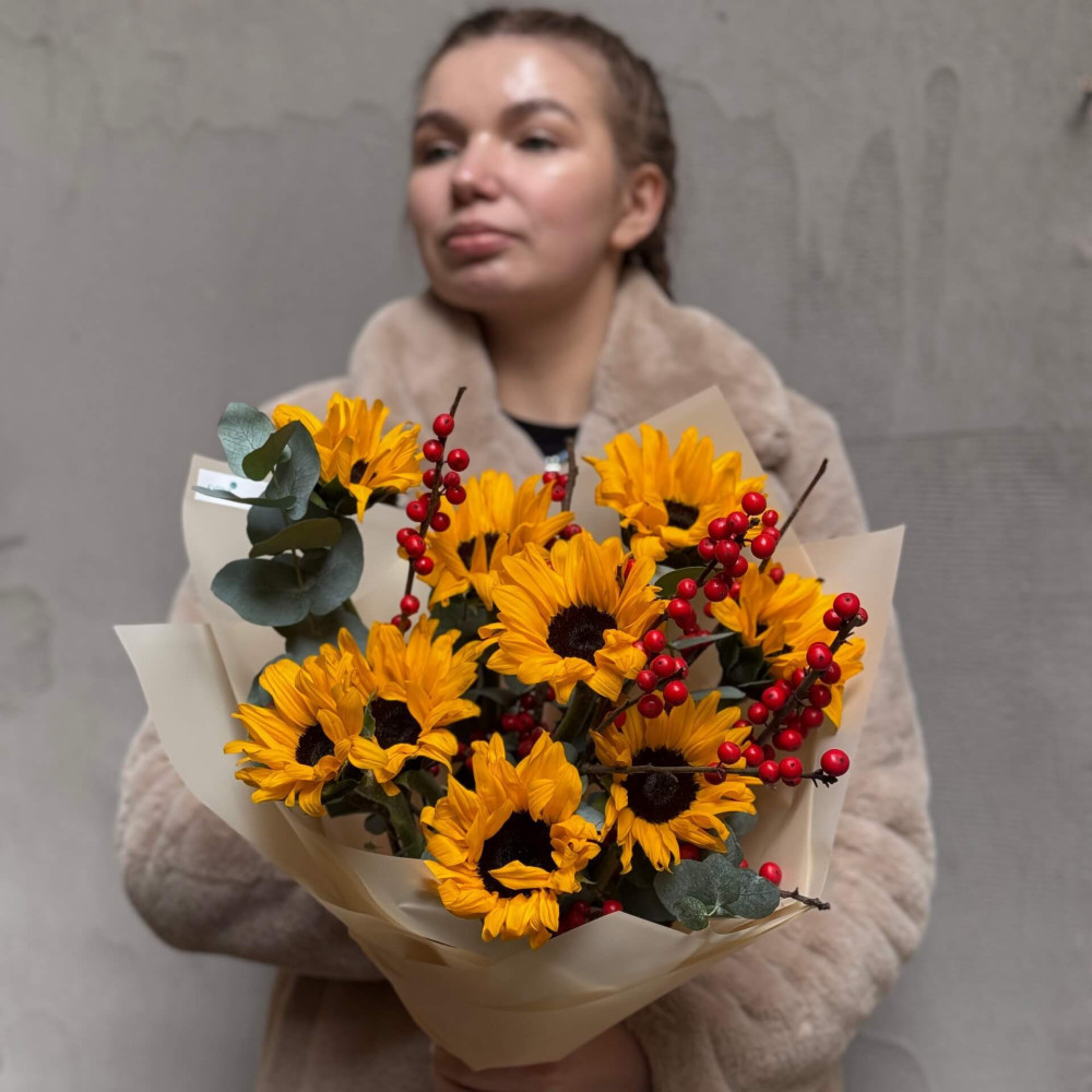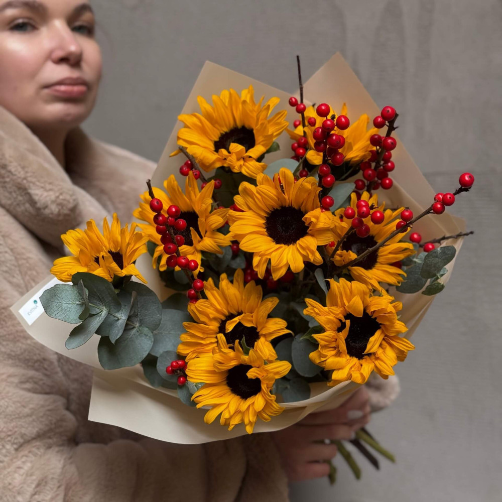 - Як замовити Букет з соняшниками та ілексом «Зимове сонечко»? ❯