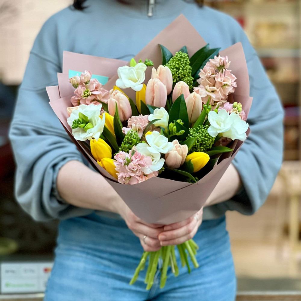 - Як замовити Букет з тюльпанами та матіолою «Весняний вітерець»? ❯