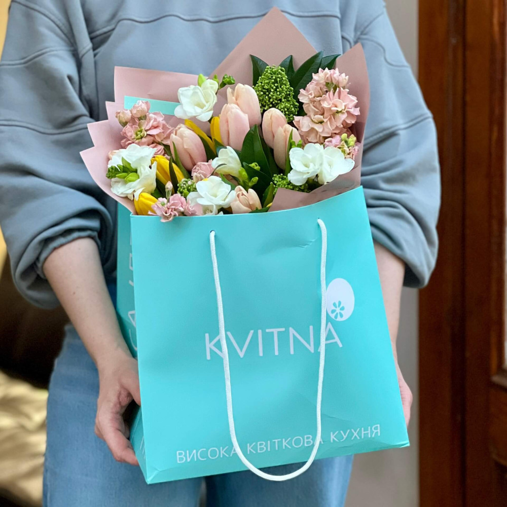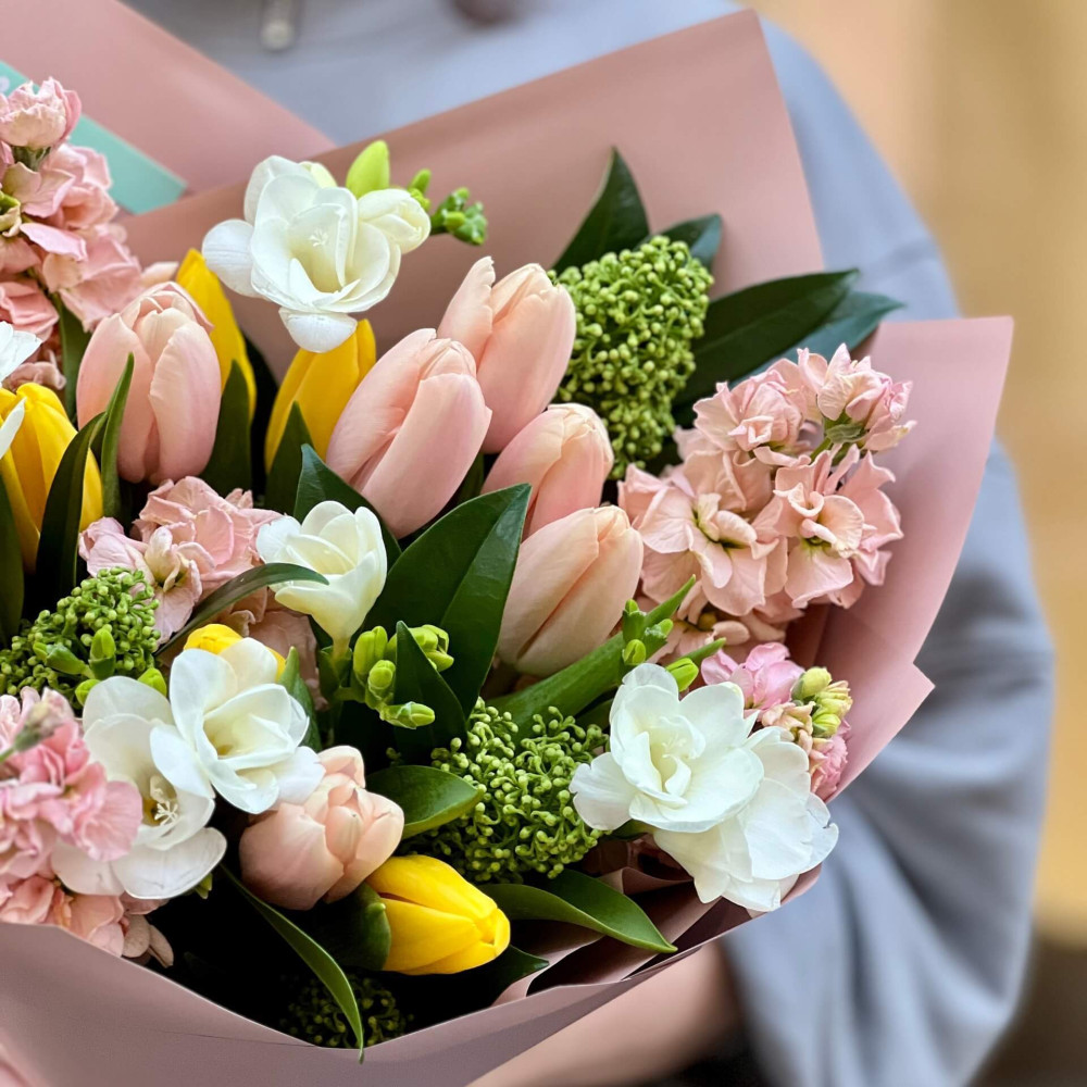 Світлий, легкий букет з персикових та жовтих тюльпанів, ароматної білої фрезії, не менш запашної персикової матіоли та вічнозеленої скімії. Вдихни його аромат – так пахне весняний вітер, коли цвітуть сади.