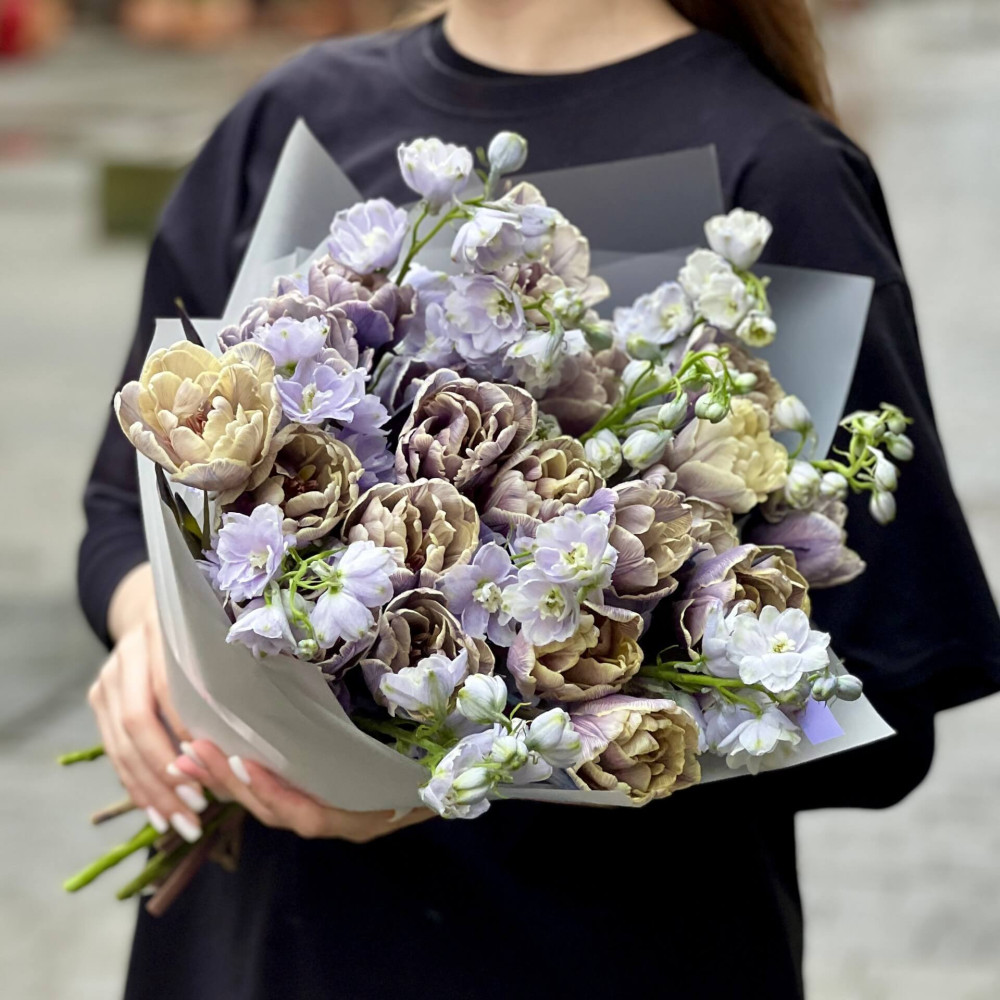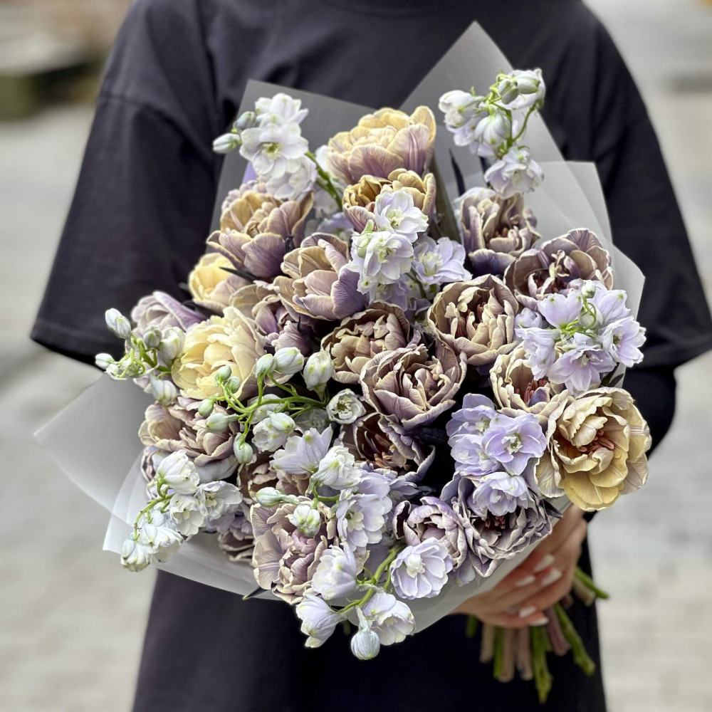 Ніжно-лавандовий дельфініум тут у дуеті з незвичайними махровими тюльпанами синьо-бузкового кольору з кремовими прожилками, немов якась фіалкова туманність в сузір'ї Оріона. Поєднання, яке неодмінно приємно здивує.